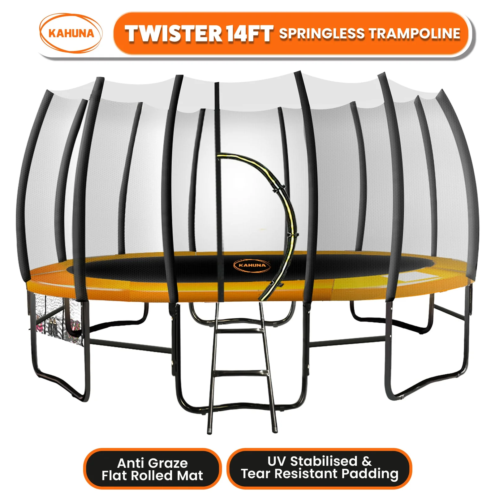 This springless trampoline also comes equipped with U-shaped legs and a ground anchoring kit to ensure stability and reduce the risk of the trampoline toppling over or sinking. Additionally, the Kahuna Twister Springless Trampoline has a hanging mesh compartment, a ladder and two pairs of anti-slip jumping socks for added safety.