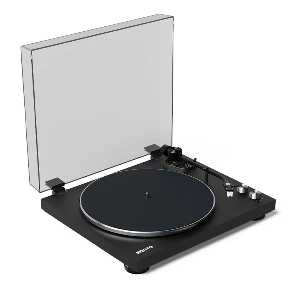 Kanto OBI3 Turntable - Matte Black with Kanto ORA 100W Powered Speakers - Black Bundle - Kanto OBI3 Belt Drive Turntable with Phono Preamp -Bring the warmth of vinyl into your home with a turntable that blends timeless character with modern convenience. The Kanto OBI3 is designed to look as good as it sounds, with its clean, seamless finish, flush-mounted hinges, and a polished aluminium platter.Enjoy the tactile feel of vinyl with thoughtful details, like a responsive pitch control knob that lets you slow things down, speed them up, and explore new layers in your favourite records. With the flexibility of Bluetooth 5.3 for wireless listening or a classic RCA connection with the built-in phono preamp, the OBI3 works seamlessly with just about any speaker setup. Outfitted with the trusted Audio-Technica AT3600L cartridge, it delivers smooth, balanced sound that makes your records shine. Stylish, easy to use, and ready to play straight out of the box, the Kanto OBI3 makes rediscovering your vinyl collection a pleasure.