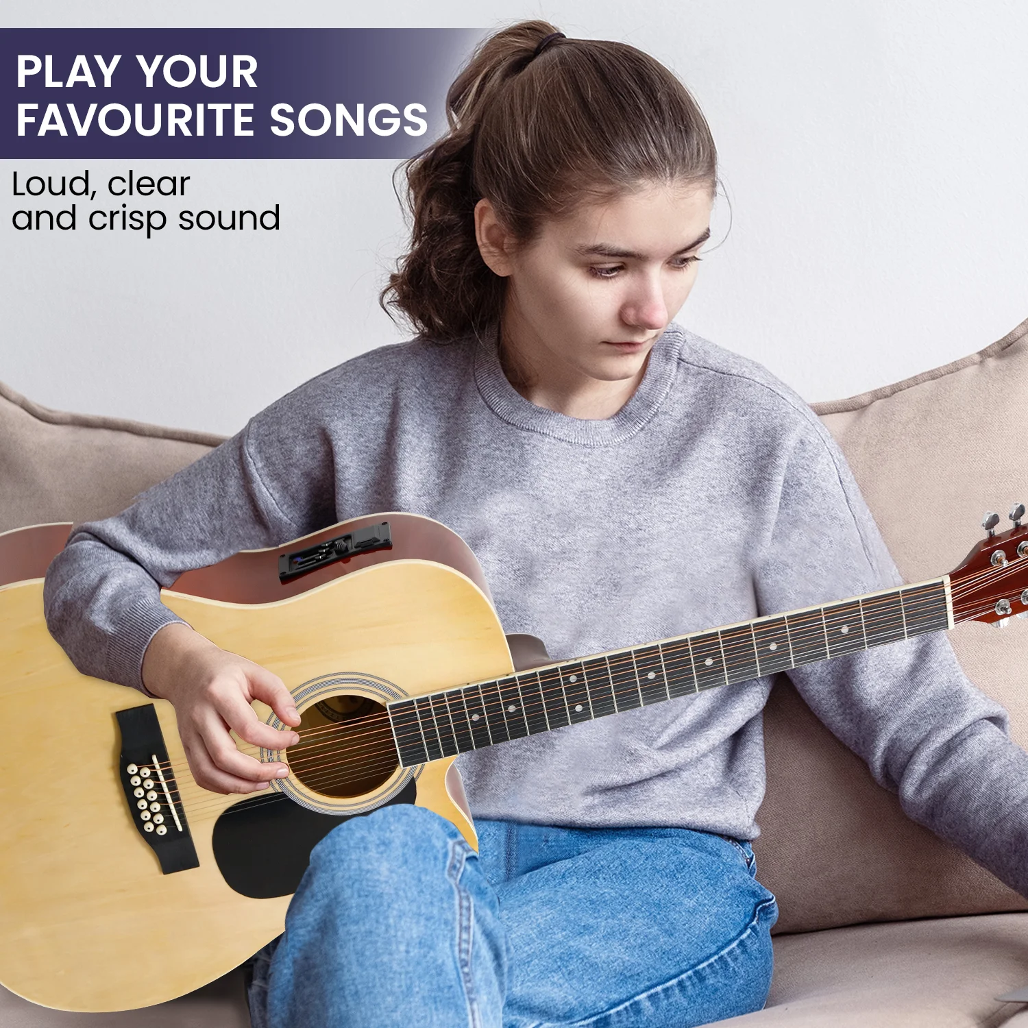 Play the loud, clear and crisp acoustic sound of this amazing 12-string guitar from Karrera! Made with a high-quality wooden body, this awesome guitar is fitted with 12 highly durable steel strings tied to a sealed tuning machine head so you can configure the sound into your own preferred pitch. It also has built-in 505 EQ.