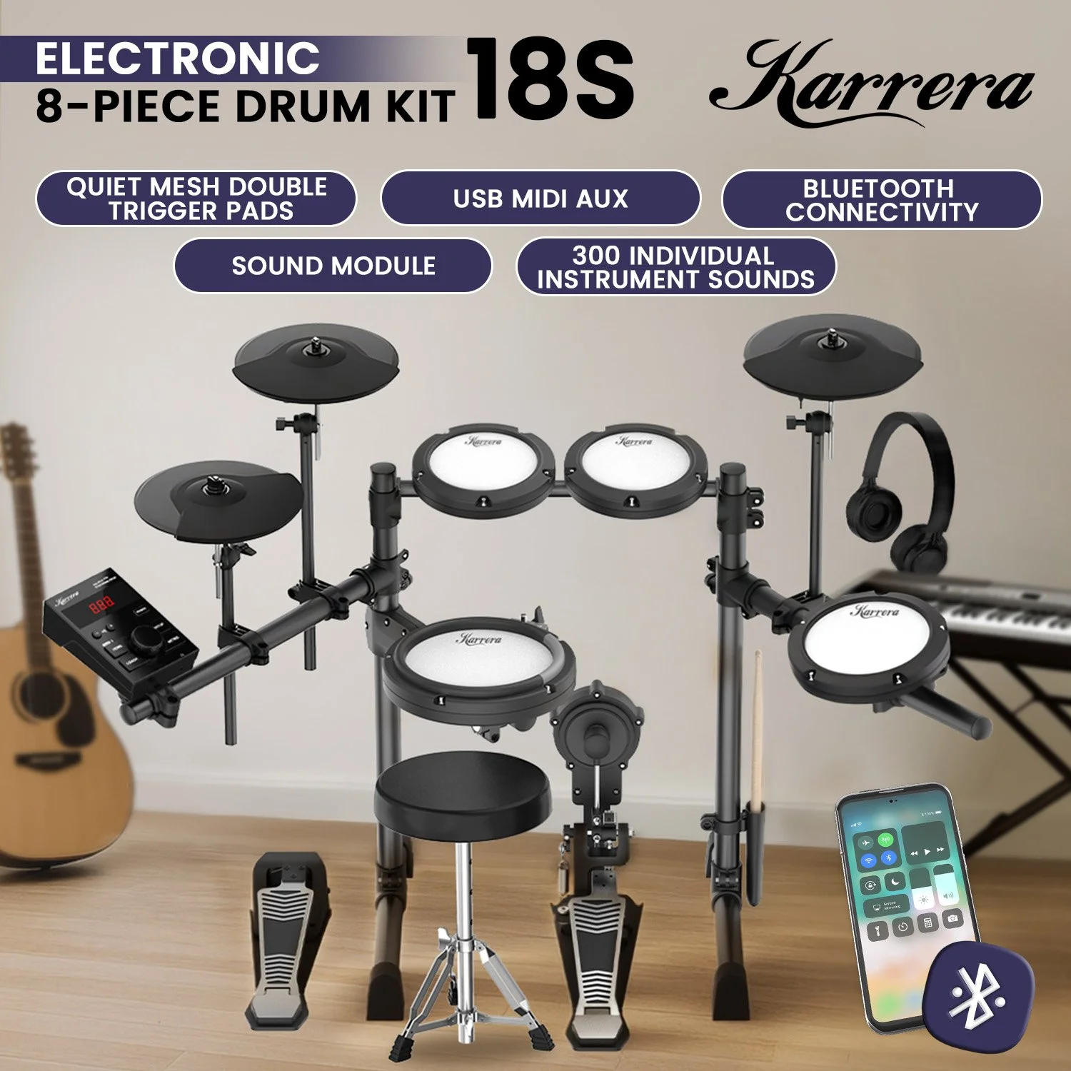 Karrera 18S Electronic Drum Kit Mesh Pads 8in Snare Bluetooth Sounds USB/MIDI Output Kick Pedals Drum Coach & Metronome