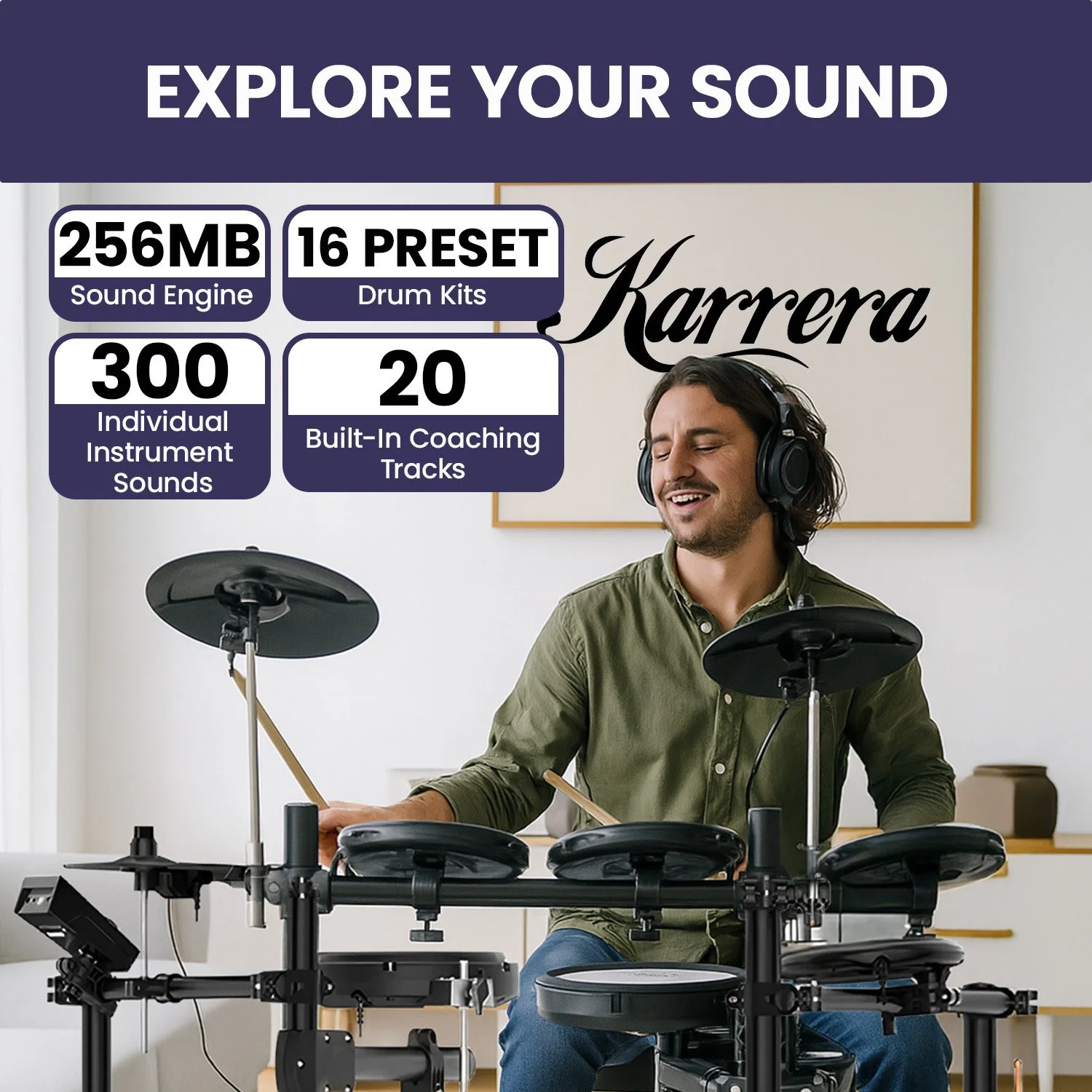 Experience professional-level drumming, whether you are performing live, recording in the studio or honing your skills in practice. The Karrera 18S Electronic Drum Kit features responsive mesh drum heads, double-trigger pads, and half-silicone cymbals with choke for exceptional control and feel.