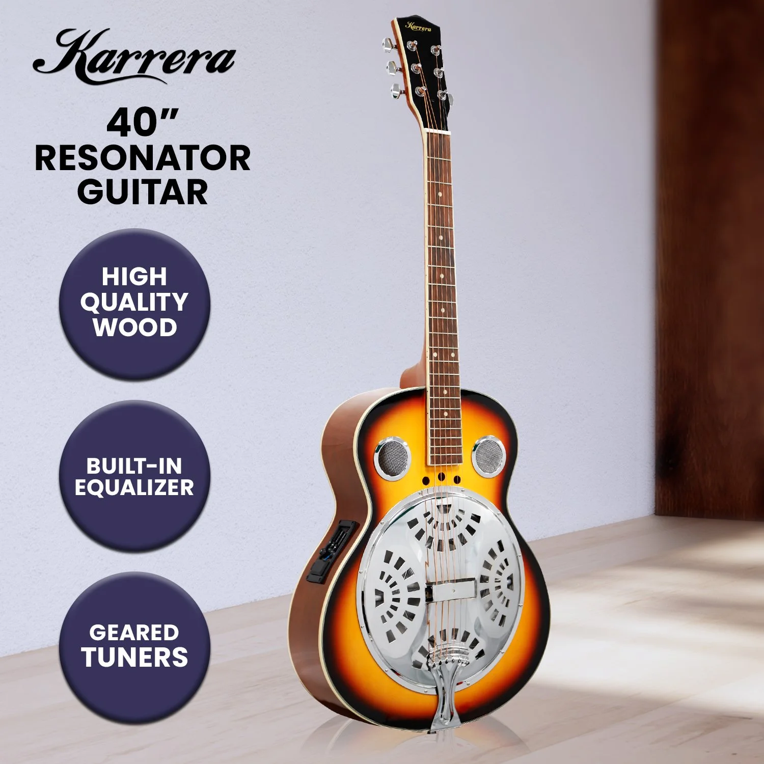 Expand your musical horizons and be mesmerized by the beautiful tone of the Karrera 40-inch Resonator Guitar! Made from high-quality wood and steel, this 6-stringed guitar is incredibly sturdy for everyday practice. Its material and shape produce a loud and crisp tone emanating from its metal plate for a truly distinctive acoustic sound that's sure to impress.