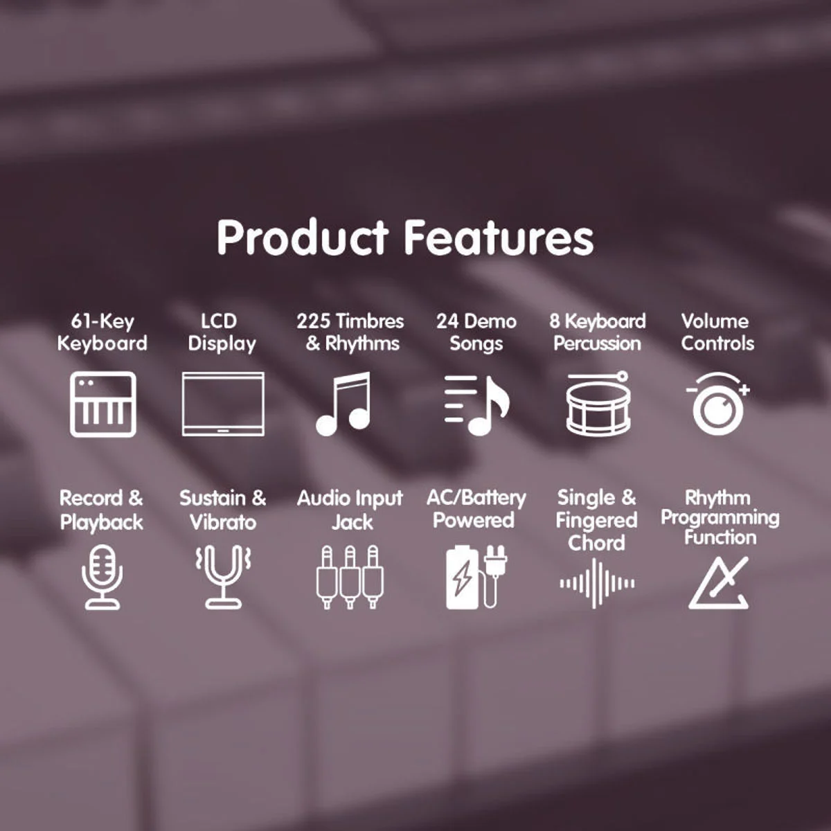 This keyboard is loaded with 255 timbres, 255 rhythms, 8 percussion buttons, and 24 demonstration songs for