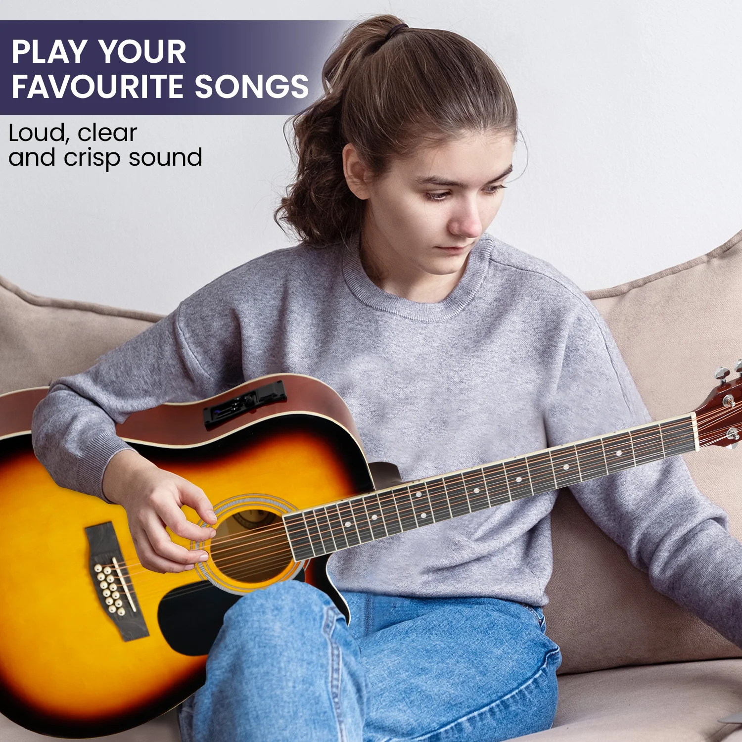 Play the loud, clear and crisp acoustic sound of this amazing 12-string guitar from Karrera! Made with a high-quality wooden body, this awesome guitar is fitted with 12 highly durable steel strings tied to a sealed tuning machine head so you can configure the sound into your own preferred pitch. It also has built-in 505 EQ.