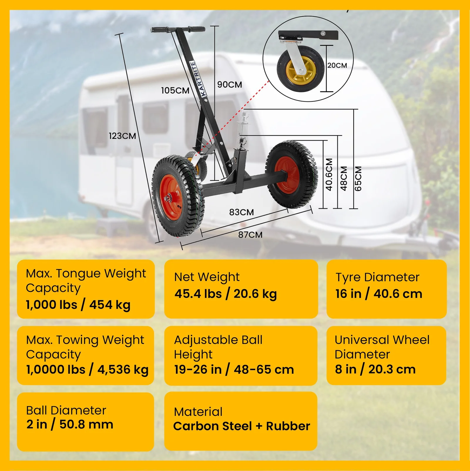 The pneumatic tyres and 20cm swivel castor for the third wheel provide smooth movement, while the sturdy 1000-pound tongue weight capacity ensures this dolly is a dependable option for heavy-duty jobs. And did we mention the maximum towing capacity of 10000 lbs? Whether youre navigating through tight areas or managing substantial loads, the Kartrite Trailer Dolly Caravan Mover simplifies the process!