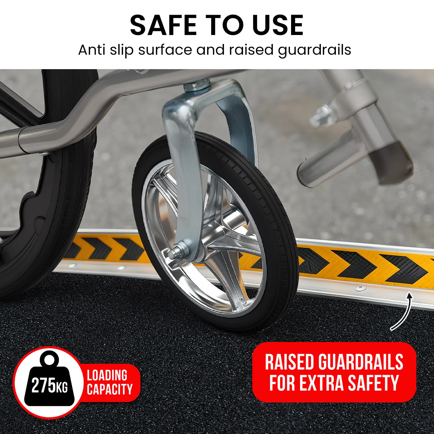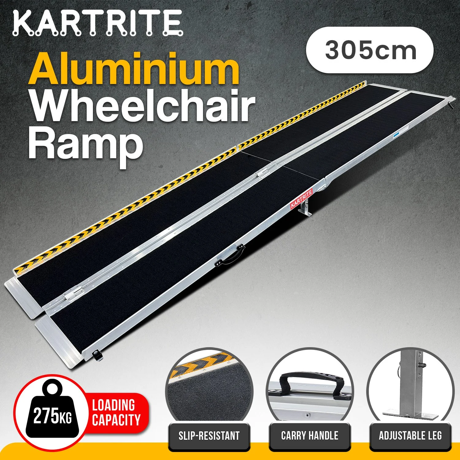 Make mobility simpler with the Kartrite foldable aluminium wheelchair ramp. Designed for wheelchairs, scooters and rollators, it provides safe access to steps, kerbs or vehicles. Its suitcase style fold makes it easy to carry and store, while the anti slip surface and raised side rails add security. Built from high strength aluminium, it supports up to 275kg, offering reliable use at home or outdoors.