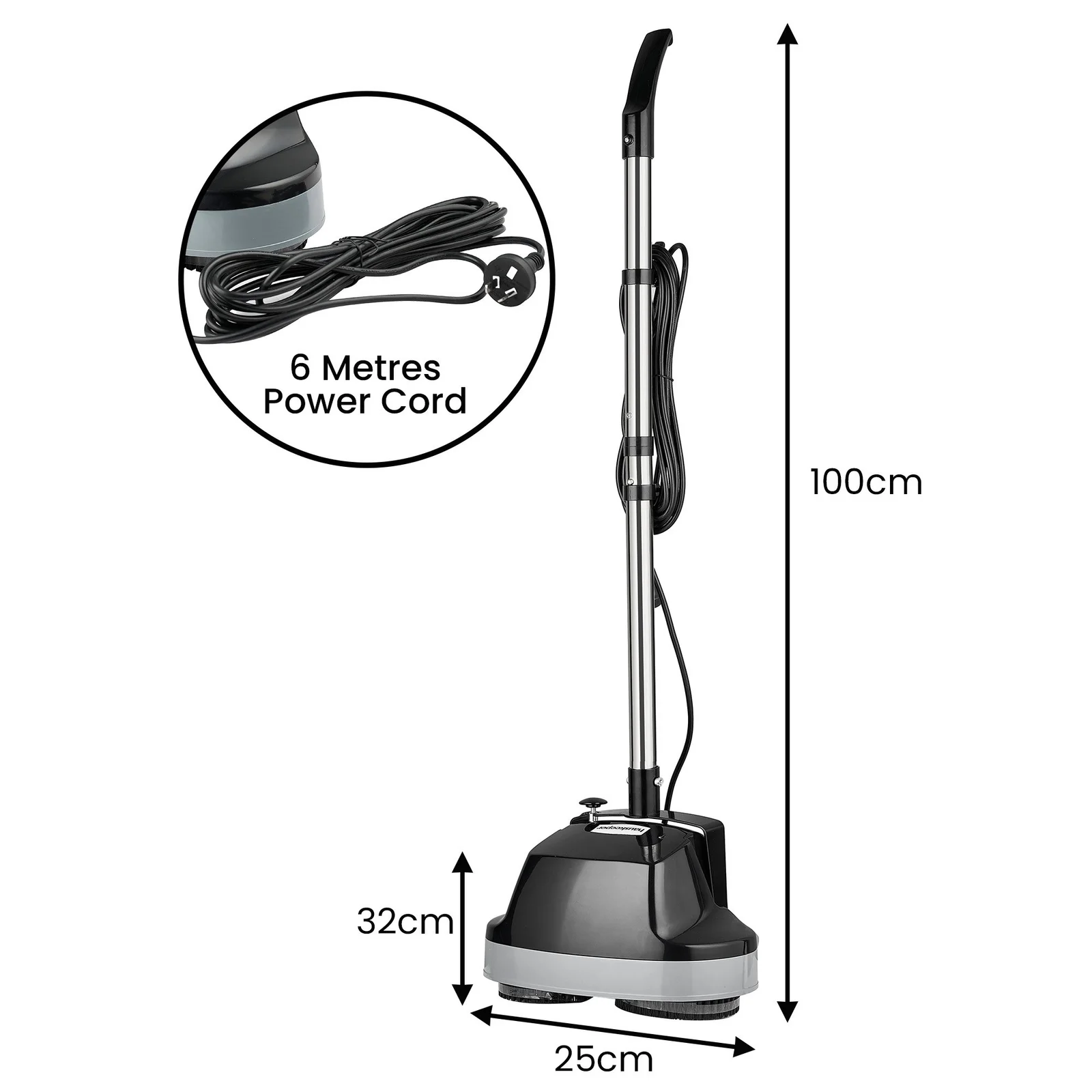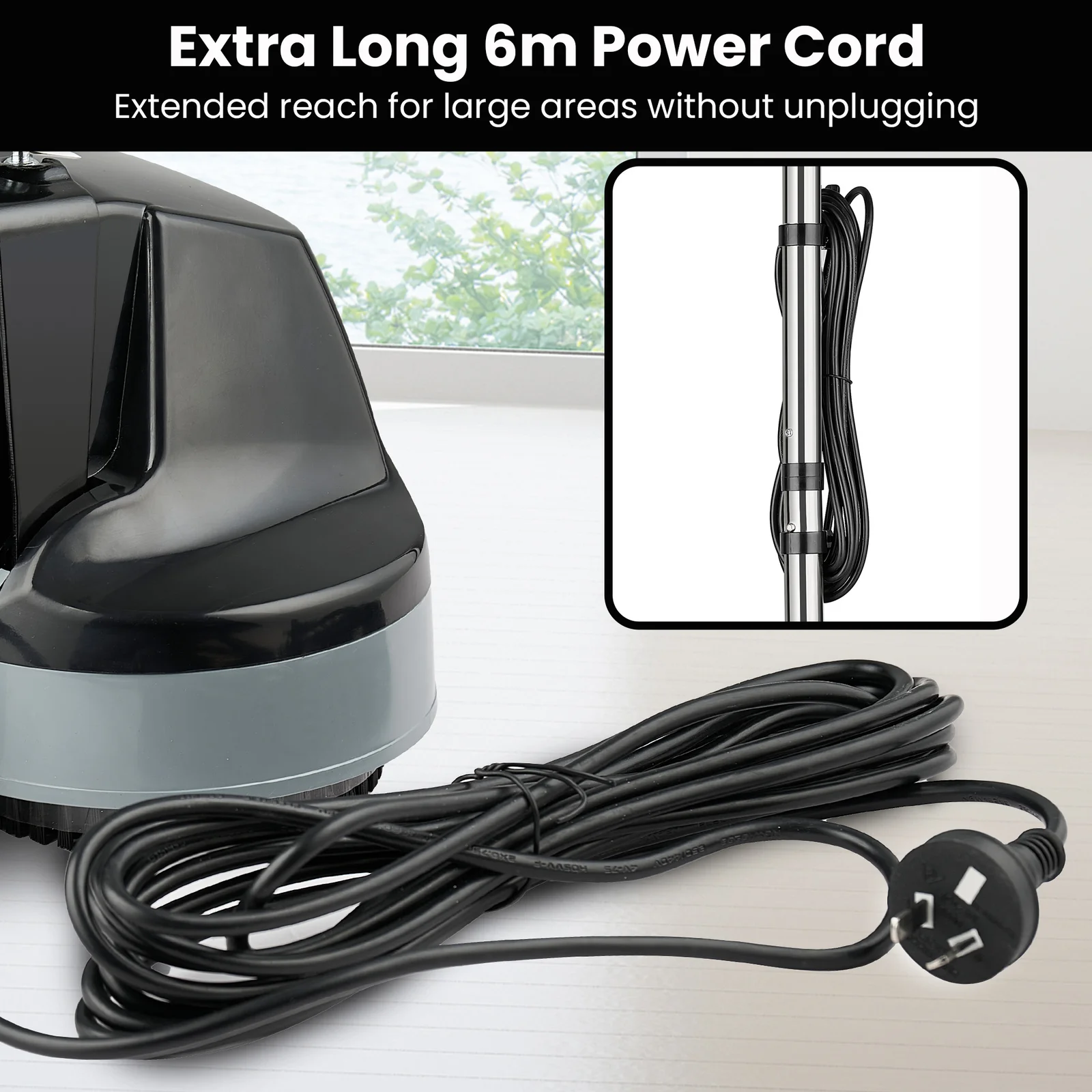 It comes with attachments for waxing and polishing various floor types, a removable chrome steel handle for easy storage, a 6m power cord with tidy hooks and rear wheels for smooth transport and upright locking.
