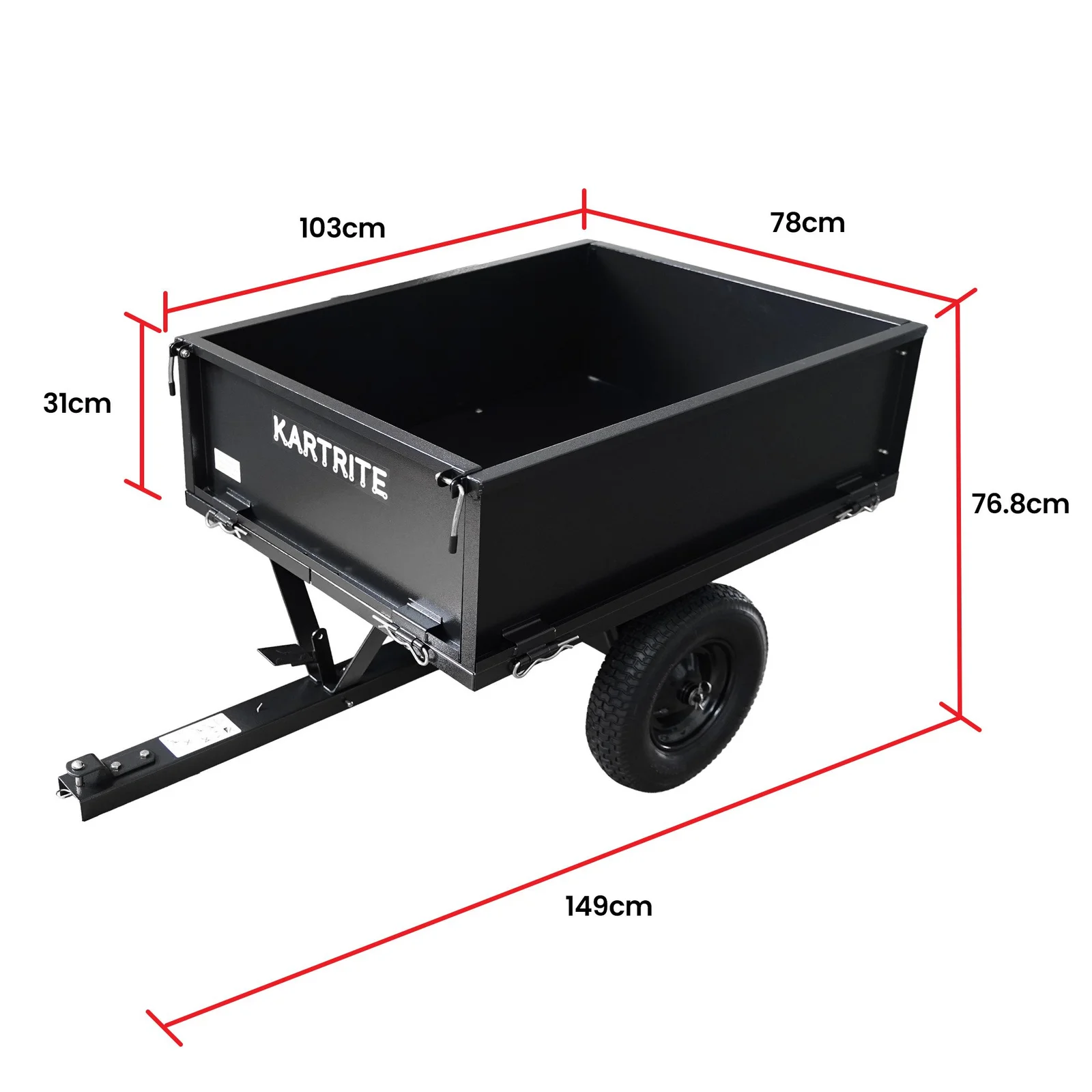 Make yard work easier with the Kartrite Dump Cart, built tough from Q235 steel and designed for heavy loads up to 270kg. Featuring pneumatic tyres, it moves smoothly across grass, gravel or uneven ground. The pin-style hitch saves you time on assembly, while the pedal release and removable tailgate make unloading effortless.