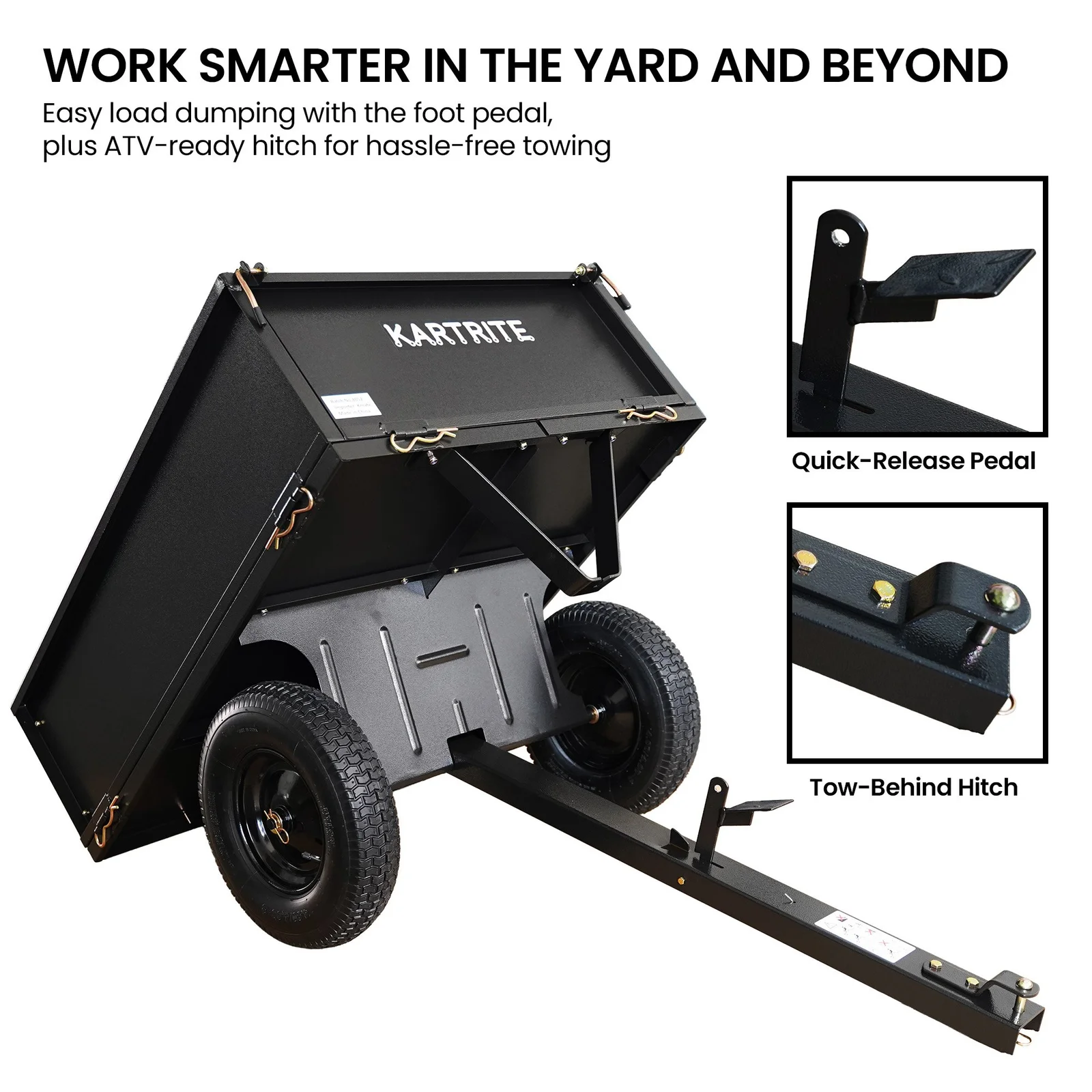Perfect for hauling tools, firewood, feed and garden supplies, this cart pairs with lawn tractors or ATVs for versatile use. With a rust-resistant, powder-coated steel frame, the Kartrite Dump Cart is your durable partner for landscaping and property maintenance.