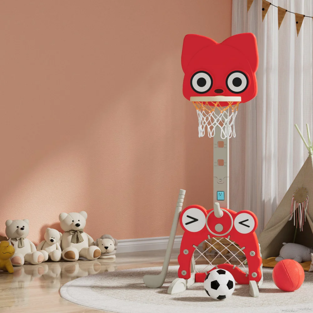 Foster your children's love of sport early with the children's Basketball Hoop Set from Keezi. Made from non-toxic PP material with a smooth surface and stable triangular base, the hoop is safe for children 3-7 years old. The 5-in-1 activity centre is not just for basketball. With a soccer game, ring toss game, golf game and removable music box, your children will be entertained for hours on end. The stand is height adjustable to account for different ages and heights. Add water to the base structure for increased stability. The stand can be used indoors or outdoors, so you can enjoy exercise anywhere, anytime. Easy to assemble and maintain, your kids will love the exciting thrills of the 5-in-1 Basketball Hoop Set from Keezi.