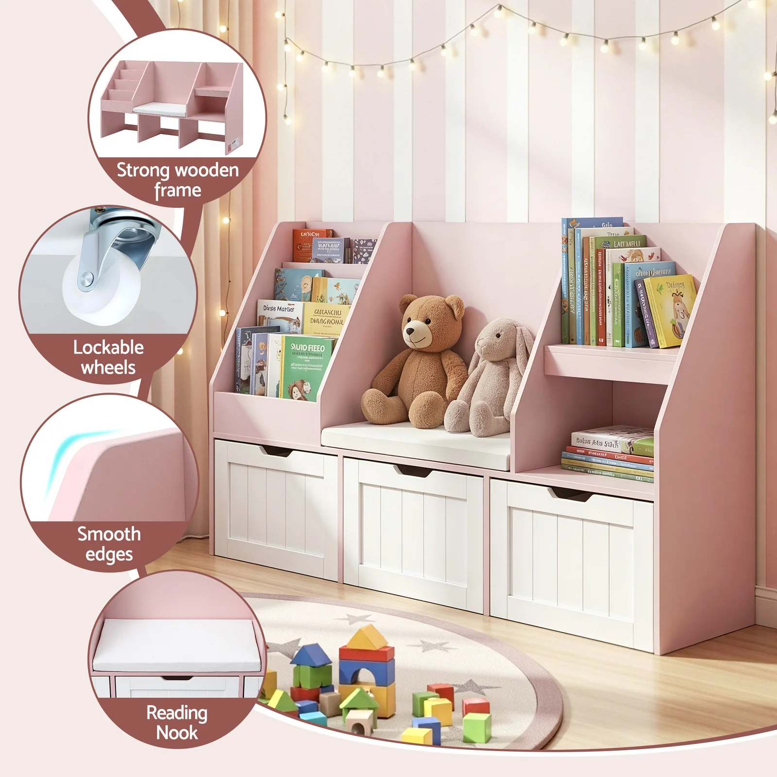 Multi-Functional Design: Combines a bookshelf, toy storage, and a reading bench in one.
