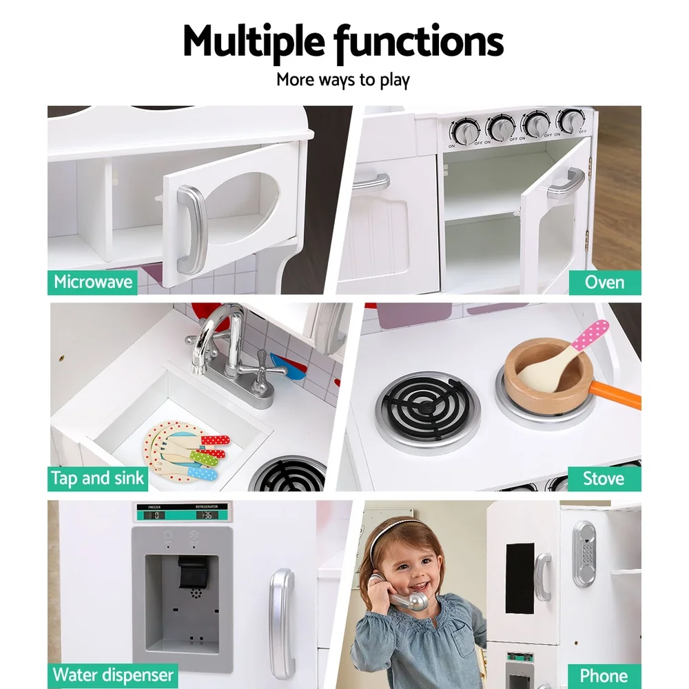 Designed to look and feel like a real kitchen, our Keezi Wooden Kitchen Play Set promises hours of pretend cooking fun for the little chef in your child. It is built at just the right size for any three-year-old and above to have a great time simulating cooking techniques, learning kitchen safety and etiquette and a whole lot more. The play set includes working knobs, kitchen components like tap, sink, stove, oven, microwave, fridge, water dispenser, knife hanger and even a phone for ordering delivery food when the chef is just too tired to cook, plus all the necessary kitchen accessories for realistic role play. Certified child-safe, our sturdy kitchen play set is ready to help your child develop his or her organisational skills in the most fun way possible.