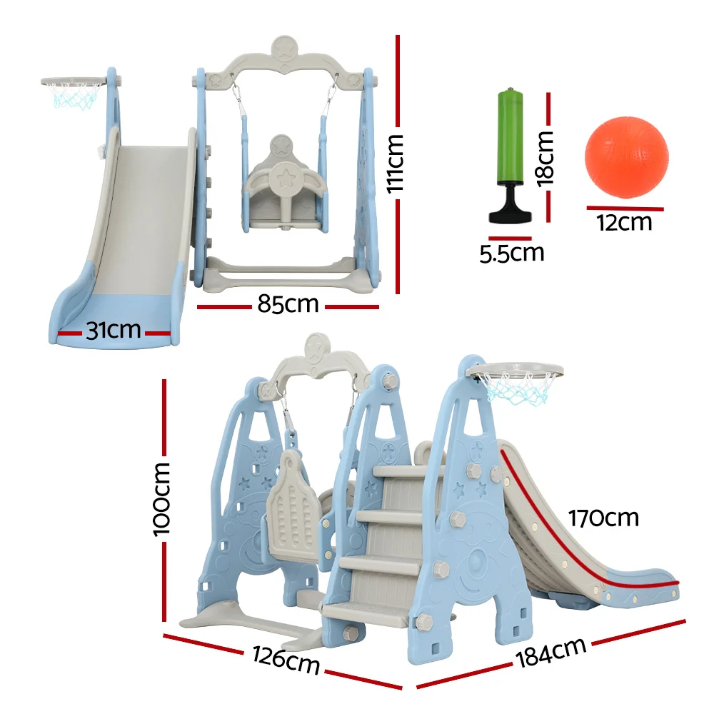 Our Keezi 3-in-1 play set comes with a long slide, safe swing, basketball hoop and a bonus ball and pump, giving your child unlimited hours of fun and engaging play. Crafted from durable, high-density non-toxic material, this fun-filled play set has a triangle force structure that prevents tilting. Plus, the water infusion design increases weight capacity and improves overall stability. Additionally, it has wide, gapless stairs, smooth rounded edges, firm-grip handles, U-shaped stable base, and a secured one-piece swing hanger, ensuring your child’s safety while playing. You can use this play set both indoors and outdoors.