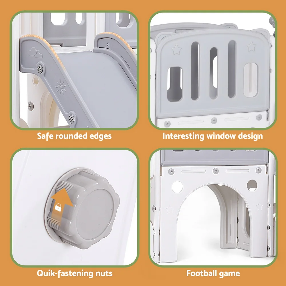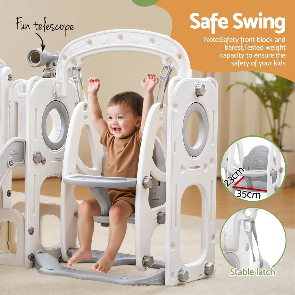 Keep your kids active and entertained with the Keezi 4-in-1 play set. It includes a child-safe swing, wide platform, fun telescope, and dual ladder for endless fun. Built from premium HDPE in stylish grey and white, it features anti-slip steps, safe grip handles, and ample bottom space for toy storage. One ball and ring are included for added play. Easy to assemble and ideal for indoor or outdoor use. Note: Kids should be supervised by adults when using the swing.