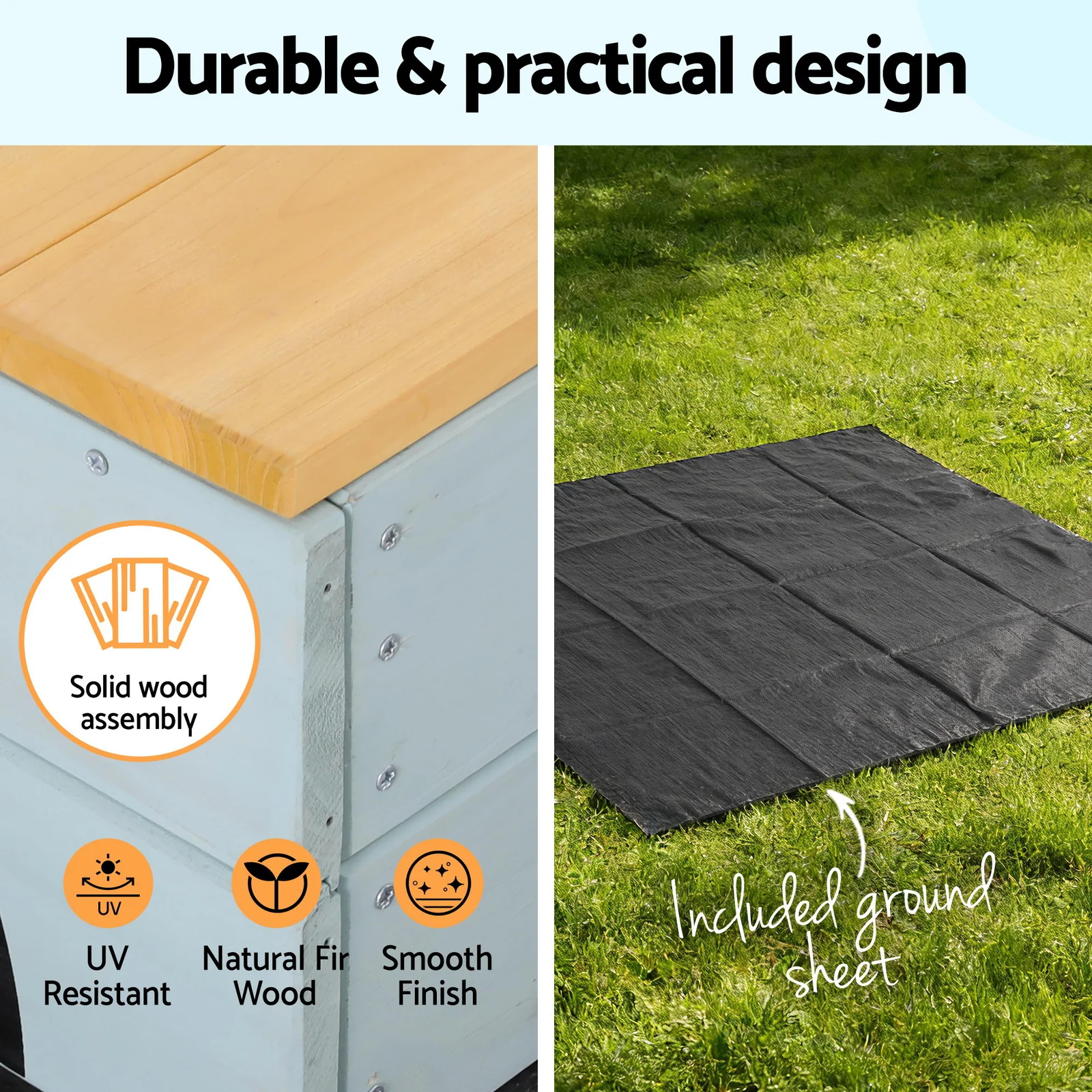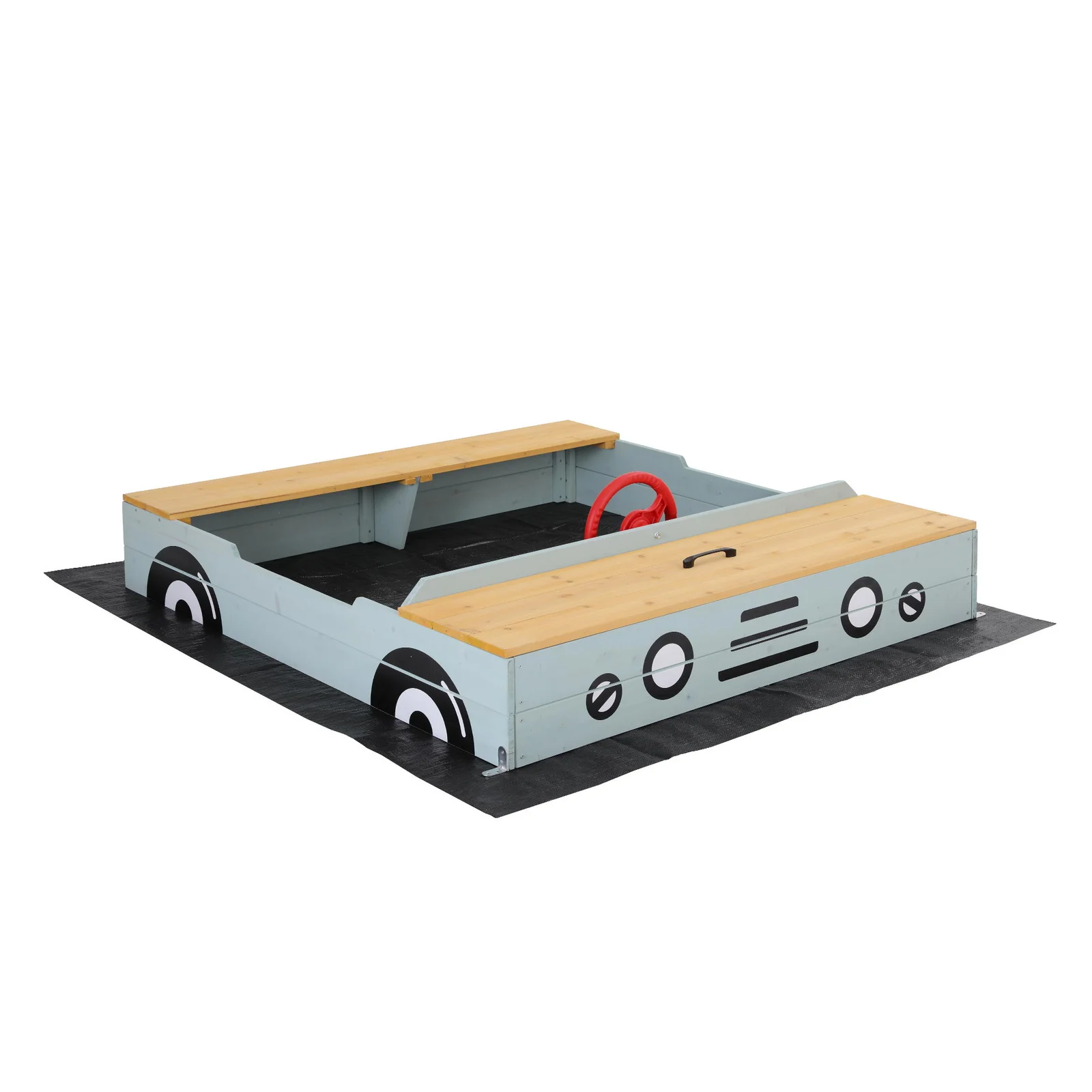 Rev up outdoor play with the Keezi car sandpit! This durable grey-blue wooden sandbox features painted headlights and tyres for a realistic driving experience. Kids will love the bright red rotatable steering wheel and spacious bench seats. A smart bonnet storage compartment with a sleek black handle keeps toys tidy, while the included ground sheet keeps sand clean. Designed to foster creative role-play and develop fine motor skills, it is the perfect backyard addition for endless fun!