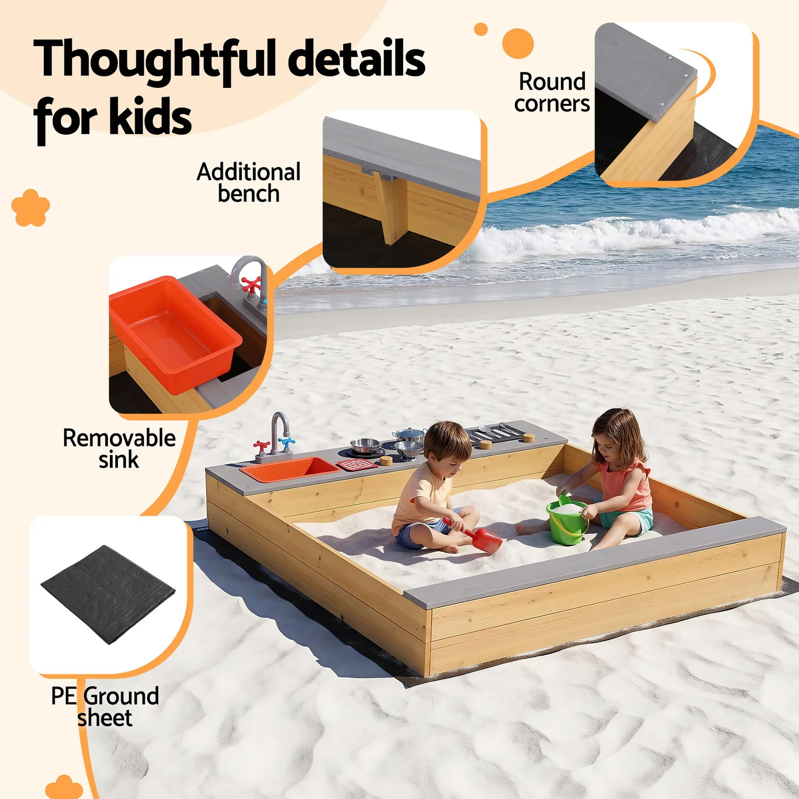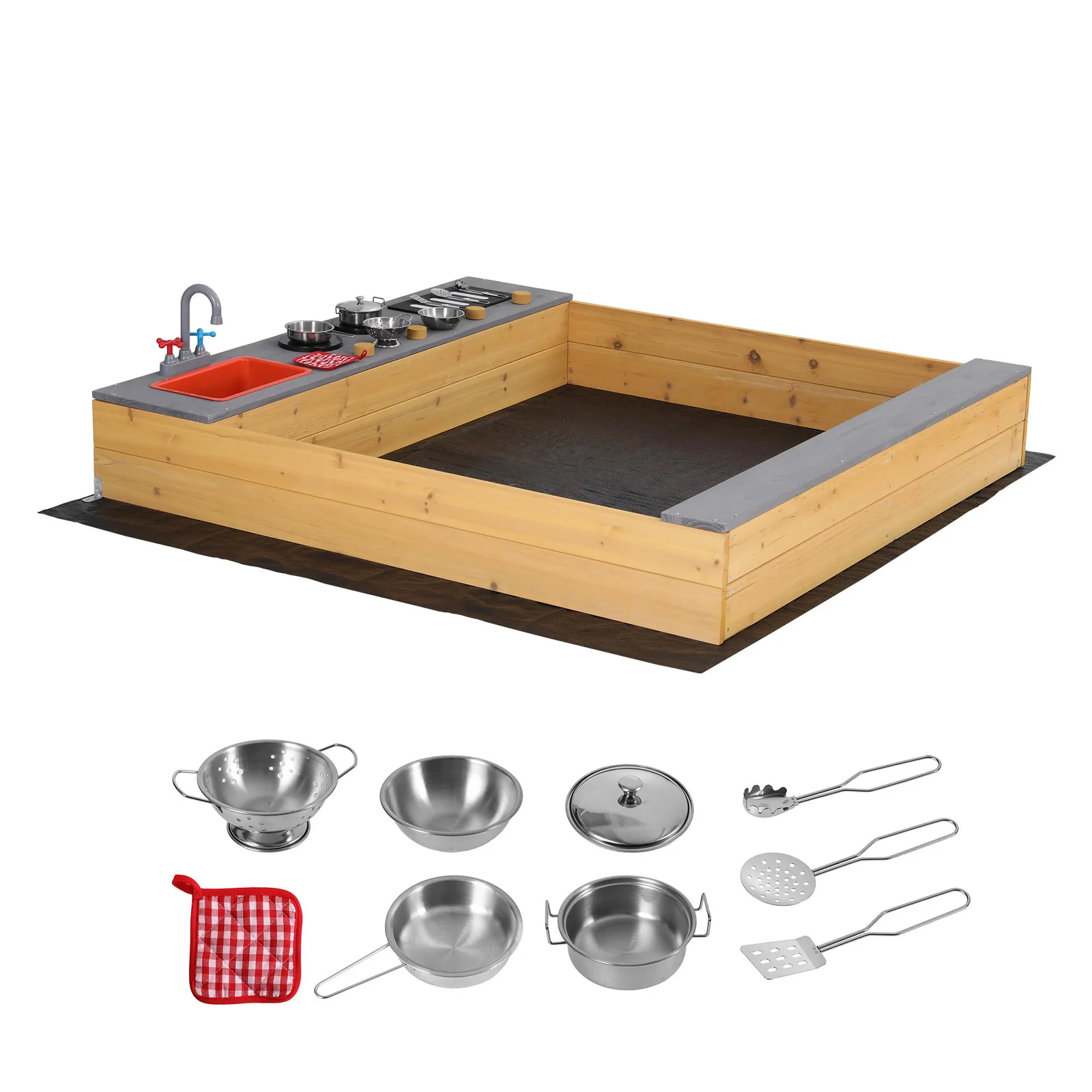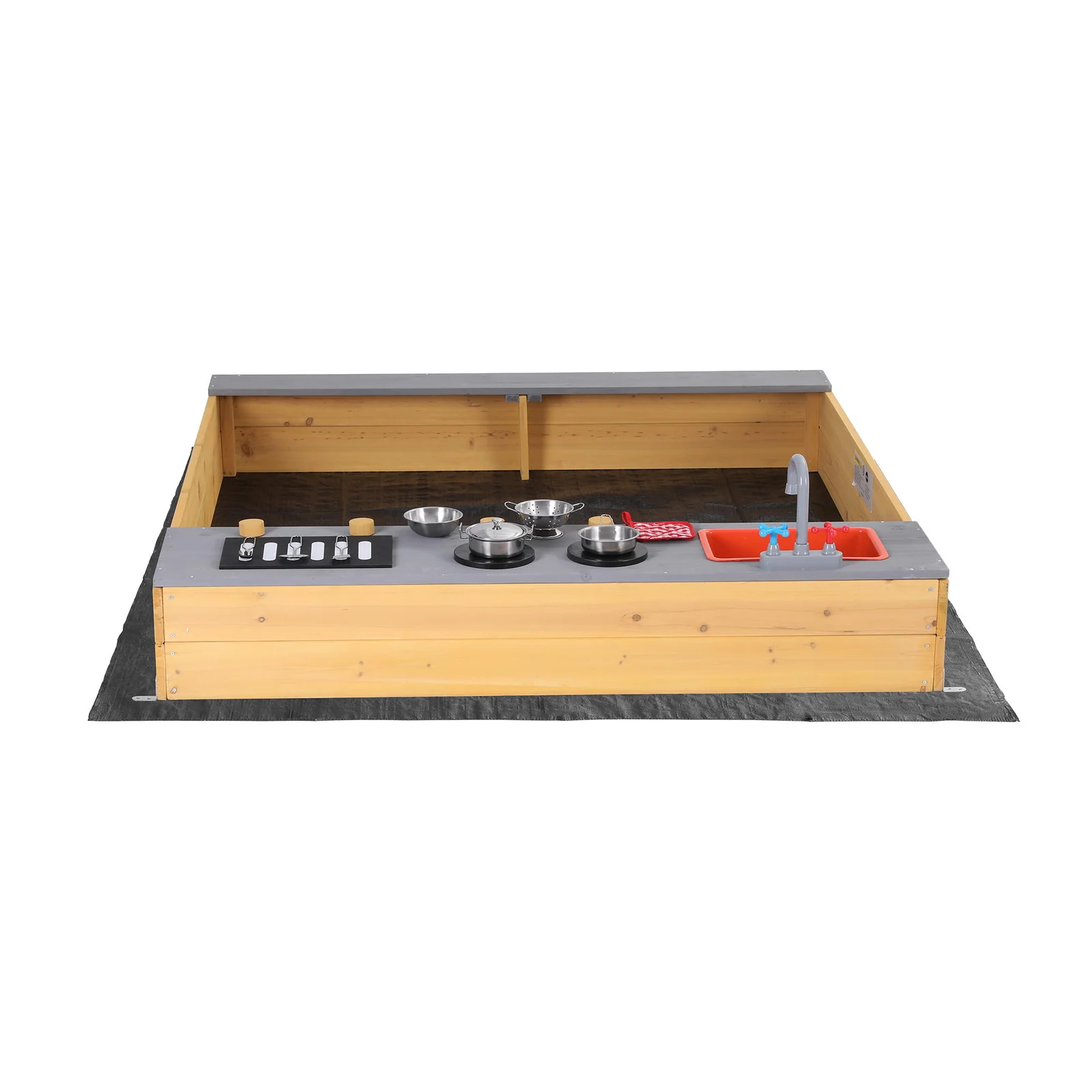 Wooden sandpit with mud kitchen toys