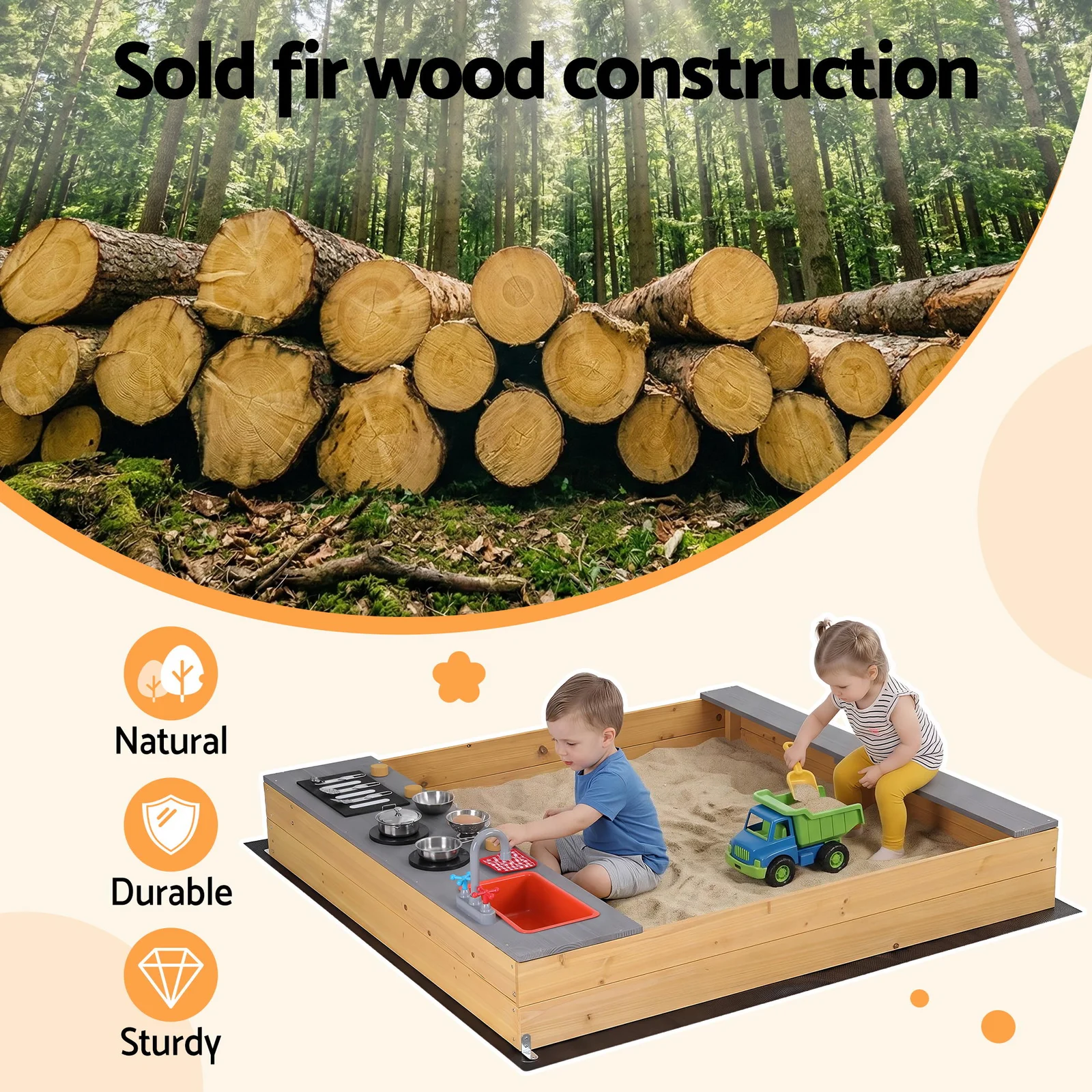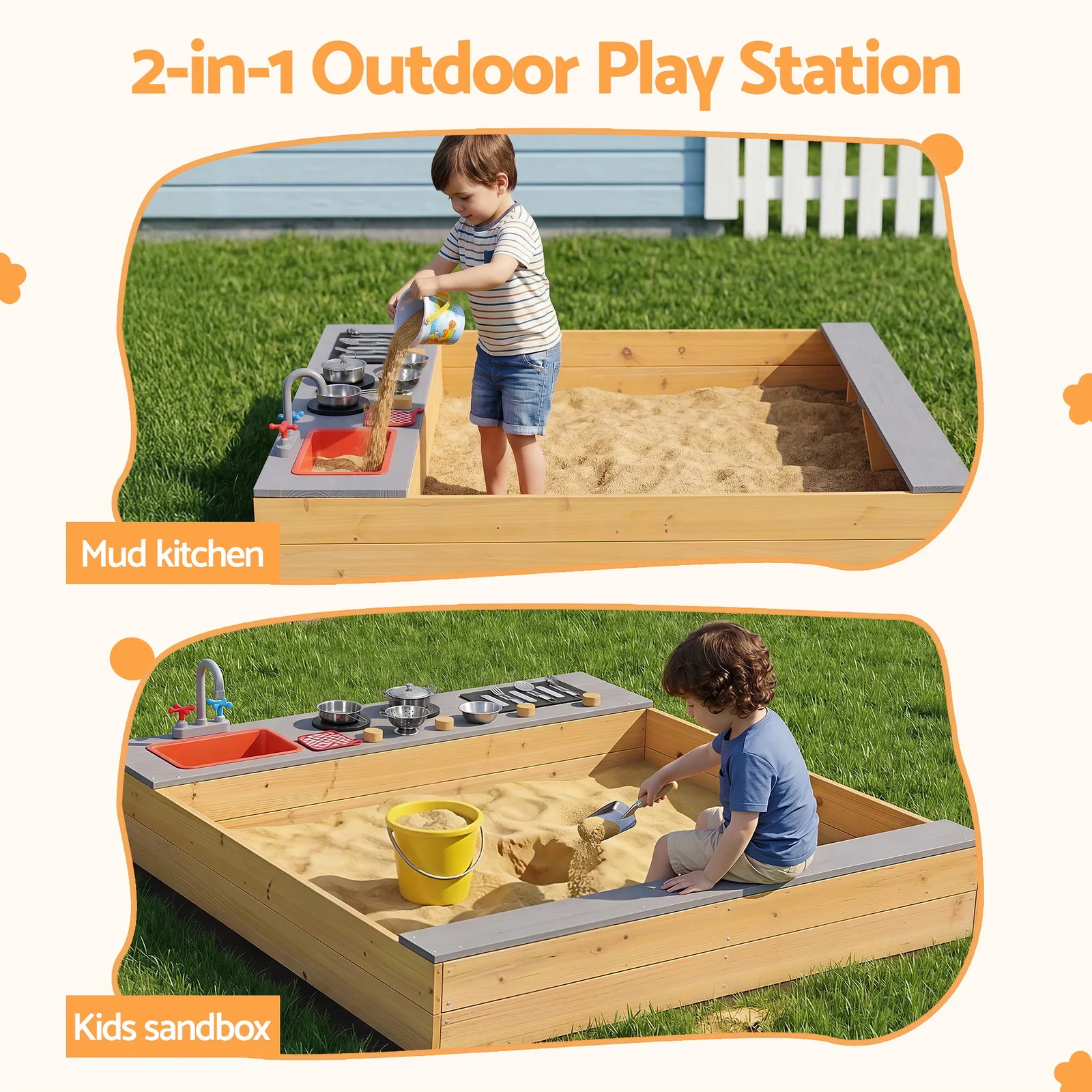 Spark creativity with the Keezi 2-in-1 Wooden Sandpit and Mud Kitchen! Crafted from weather-treated fir wood, this versatile outdoor playset features a realistic sink, tap, and stove knobs for endless cooking role-play. The spacious design includes wide bench seats for comfort and a convenient built-in storage shelf to keep toys tidy. Complete with a protective ground sheet for drainage and weed prevention, this robust station is the perfect backyard addition for sensory play. Durable, safe, and built for Aussie kids.
