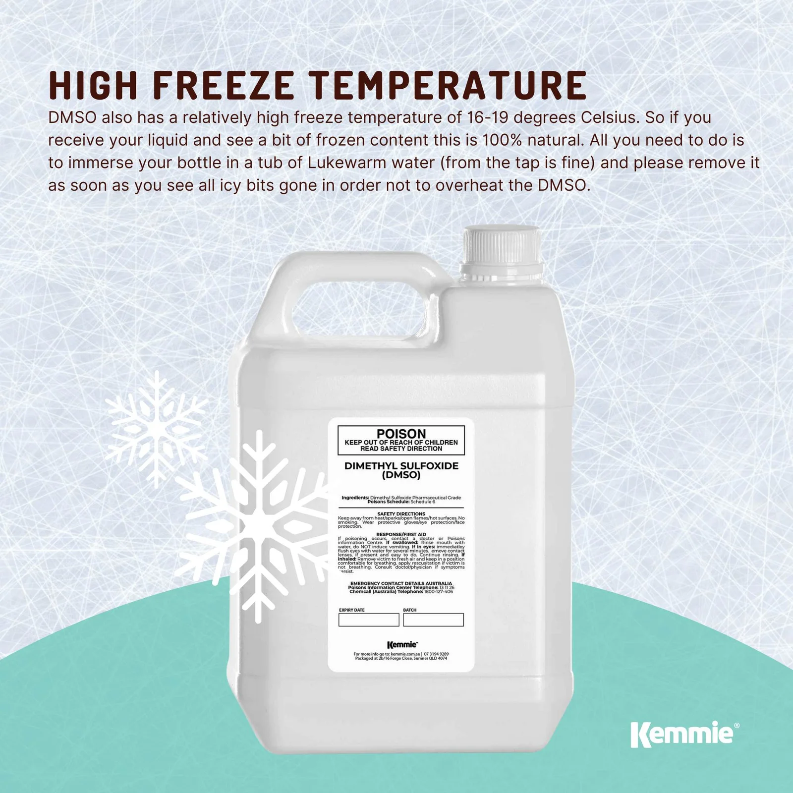 DMSO is a very temperature sensitive product. Liquid DMSO can and will crystallise in a cold environment. If this occurs, place or keep the DMSO bottle in a warm location (15°C – 20°C), and within a few hours it should go back to liquid form. For faster results, place the bottle in a clean zip lock bag, seal it, and place it in warm water. Under any circumstances, do not microwave it!