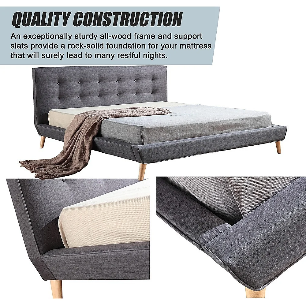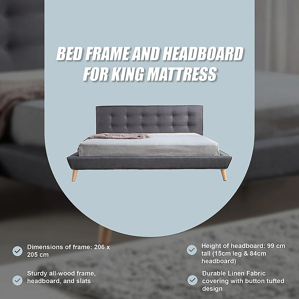 An exceptionally sturdy all-wood frame and support slats provide a rock-solid foundation for your mattress that will surely lead to many restful nights. The Linen Fabric covering is similarly durable, not to mention easy to clean. The frame is designed to accommodate standard King-sized mattresses with dimensions of 183 x 203 cm (mattress and linens not included). The headboard is 99 cm tall (15cm leg & 84cm headboard) from top to bottom, and the overall dimensions of the bed frame are 206 cm x 205 cm.
