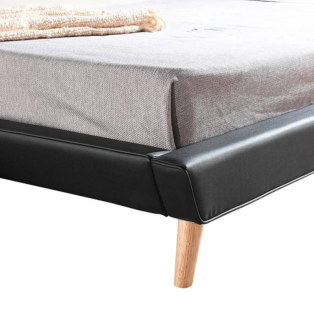 An exceptionally sturdy all-wood frame and support slats provide a rock-solid foundation for your mattress that will surely lead to many restful nights. The PU Leather covering is similarly durable, not to mention easy to clean. The frame is designed to accommodate standard King-sized mattresses with dimensions of 183 x 203 cm (mattress and linens not included). The headboard is 99 cm tall (15cm leg 84cm headboard) from top to bottom, and the overall dimensions of the bed frame are 206 cm x 205 cm.