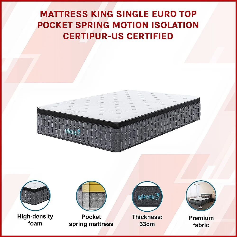 Elevate your sleep experience with the Palermo Euro Top Pocket Spring Mattress. Designed for ultimate comfort and support, this 33cm thick mattress combines innovative technology withpremium materials to ensure you wake up refreshed and ready to take on the day.
