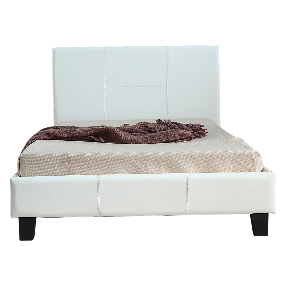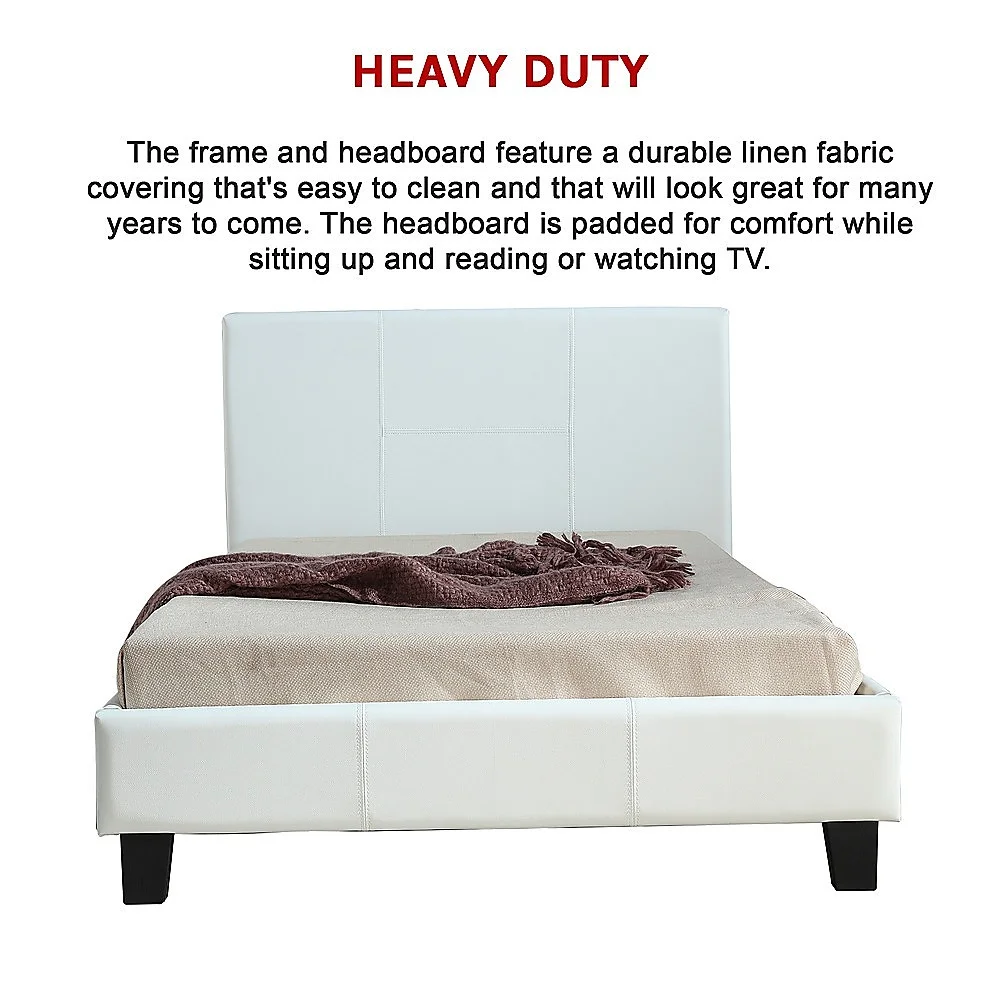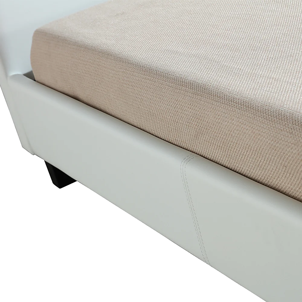 This bed from the expert craftspeople at Palermo measures 115 cm wide by 206 cm long, with a headboard that measures 88 cm tall (10cm leg 78cm headboard) from top to bottom. It fits a king single mattress measuring 106 x 203 cm. The frame and headboard feature a durable PU Leather covering that's easy to clean and that will look great for many years to come. The headboard is padded for comfort while sitting up and reading or watching TV. An attractive stitched-together look and clean, simple lines make this bed frame a perfect complement to the modern bedroom. And the white colour adds visual appeal without being ostentatious.