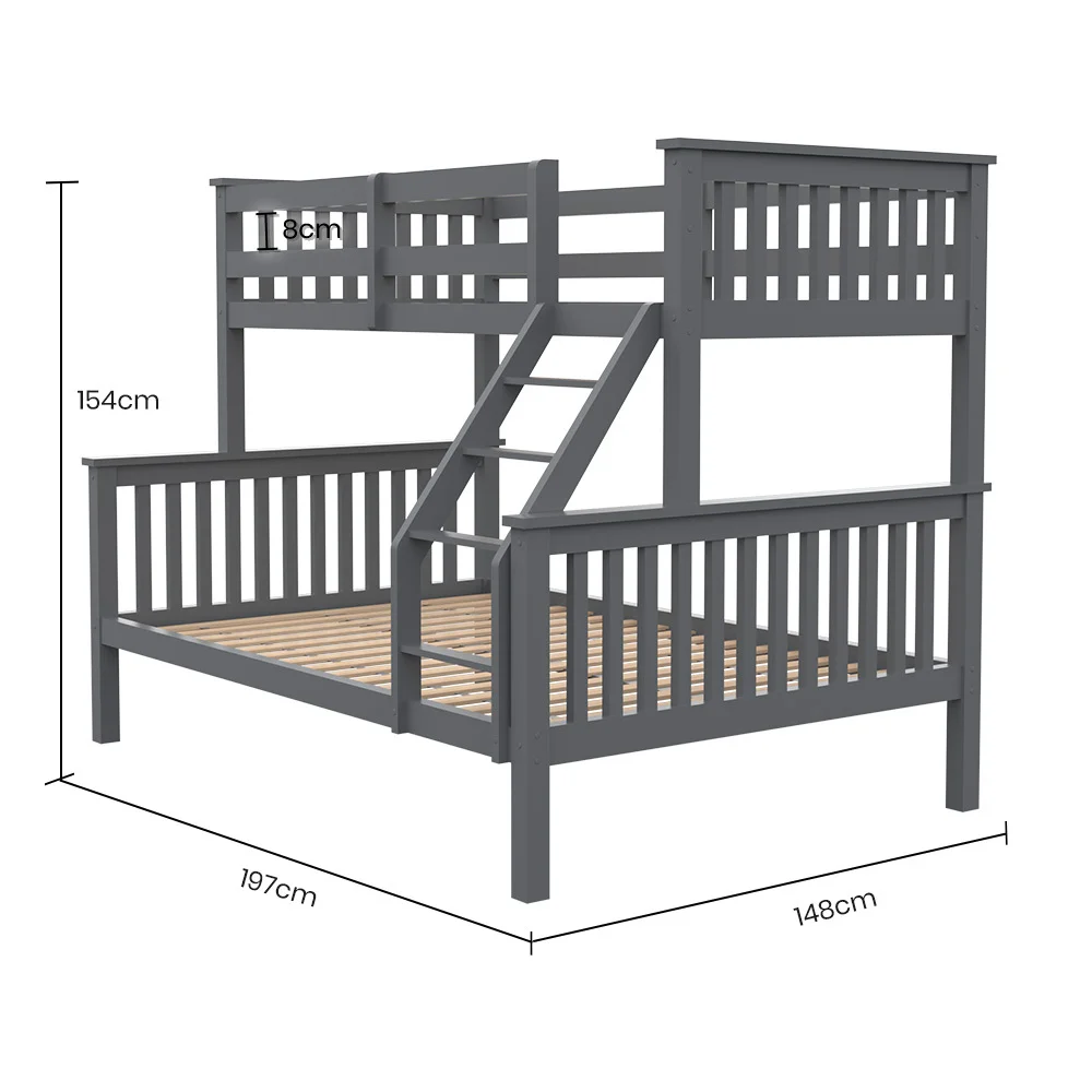 The Kingston Slumber Triple Bunk Bed Frame is crafted from solid high-quality sustainably sourced timber and is compatible with standard Australian single and double sized mattresses. Safety is paramount with SGS-certified quality, rigorously tested for superior durability. The bed features durable plywood slats and a solid, secure ladder. It even features an exclusive toy shelf which is sure to be a nice home for their favourites.