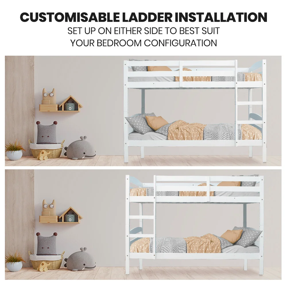 This Kingston Slumber Bed Frame Bunk Bed is crafted from solid high-quality sustainably sourced timber and is compatible with standard Australian single sized mattresses. Safety is paramount with SGS-certified quality, rigorously tested for superior durability. The bed features durable plywood slats, an extra-reinforced frame, and a solid, secure ladder.