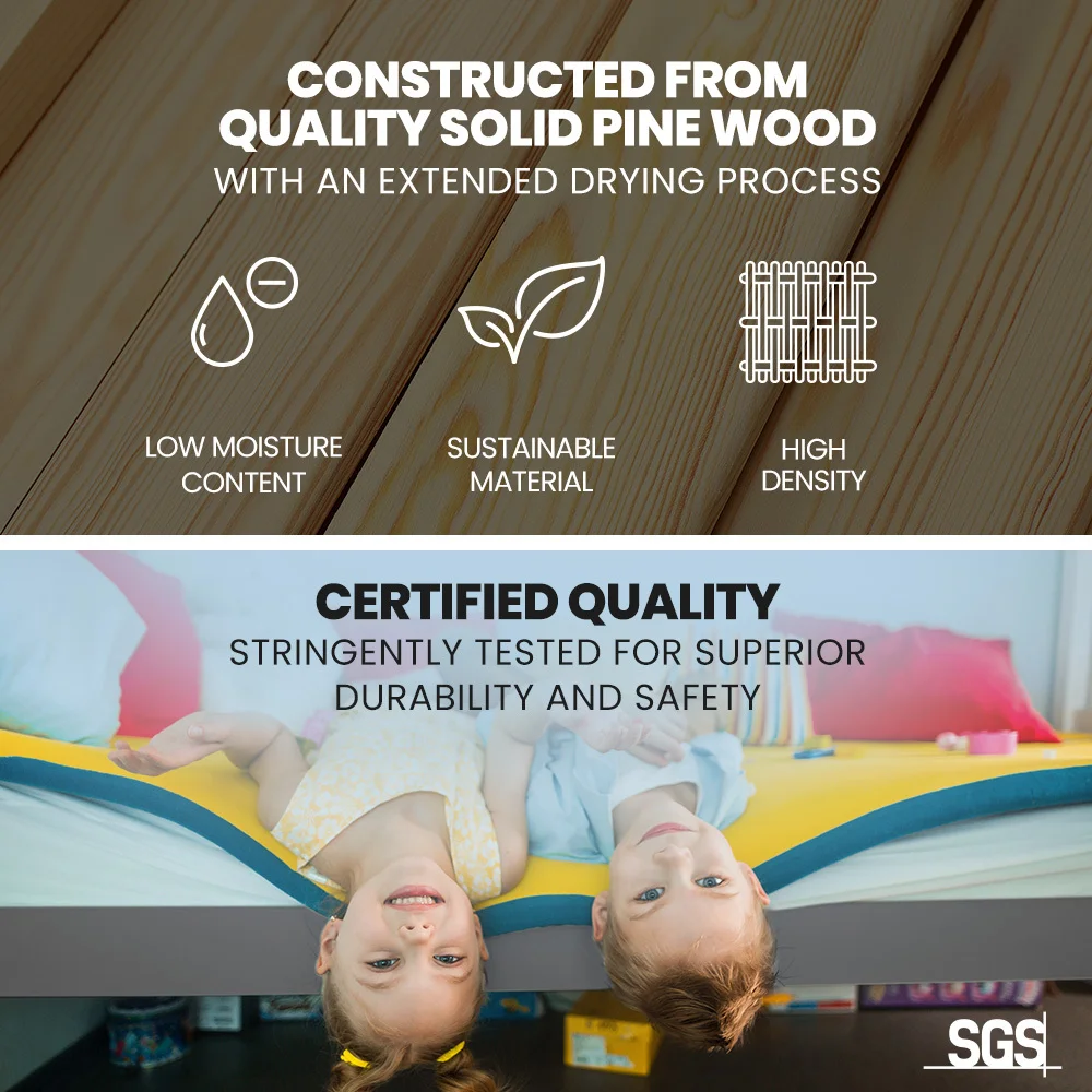This Kingston Slumber Bed Frame Bunk Bed is crafted from solid high-quality sustainably sourced timber and is compatible with standard Australian single sized mattresses. Safety is paramount with SGS-certified quality, rigorously tested for superior durability. The bed features durable plywood slats, an extra-reinforced frame, and a solid, secure ladder. It even features an exclusive toy shelf which is sure to be a nice home for their favourites.