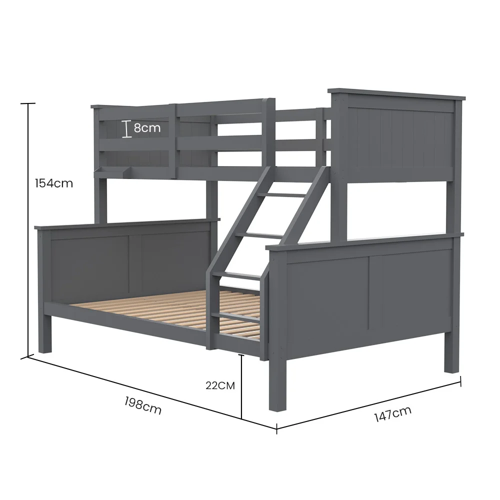 The Kingston Slumber Triple Bunk Bed Frame is crafted from solid high-quality sustainably sourced timber and is compatible with standard Australian single and double sized mattresses. Safety is paramount with SGS-certified quality, rigorously tested for superior durability. The bed features durable plywood slats and a solid, secure ladder. It even features an exclusive toy shelf which is sure to be a nice home for their favourites.