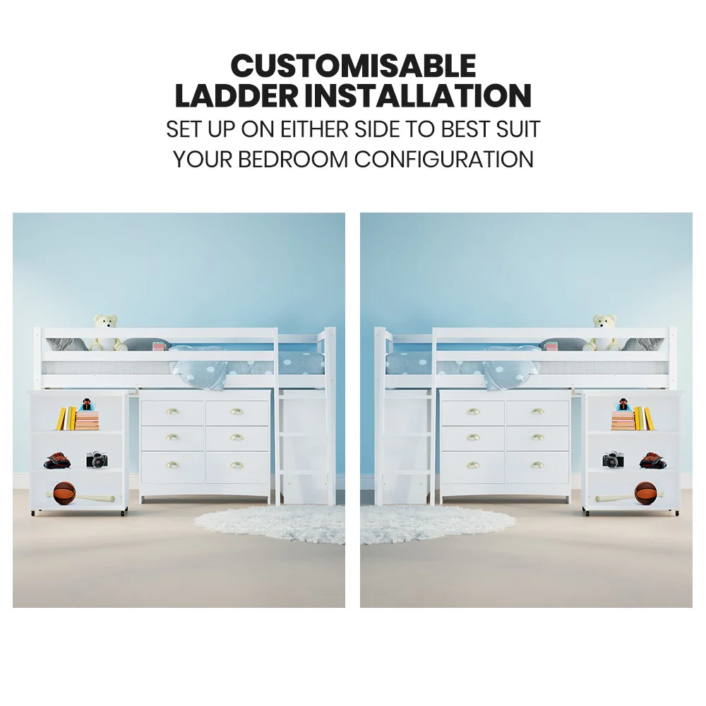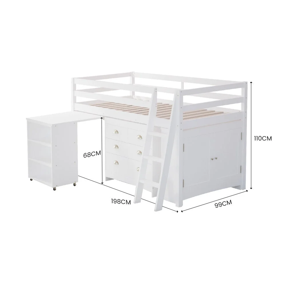 This Kingston Slumber Kids Single Loft Bed Frame with Desk, Cabinet and Storage Drawers is the perfect combination of style, functionality, and fun for your little one's room. This space-saving bed frame offers your child a perfect place to sleep, study or relax. With the pull-out desk and storage drawers and cabinet, there’s a comfortable and convenient space for your child to hit the books and store favourite things.