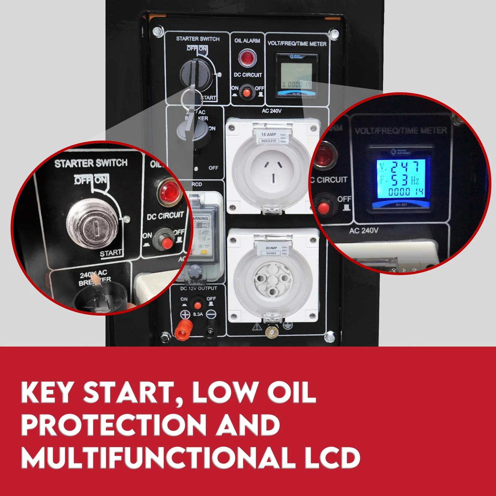 Featuring 2x heavy-duty IP66 rated 15A and 20A 240V power outlets, plus an 8.3amp 12 volt DC outlet - it could comfortably run a whole range of tools, white goods and lighting. Adding to its commercial application, it features an RCD safety switch for additional OHS assurance. The unit’s user-friendly design is facilitated by its electric key start, overload protection, low oil indicator and multifunctional LCD monitor.
