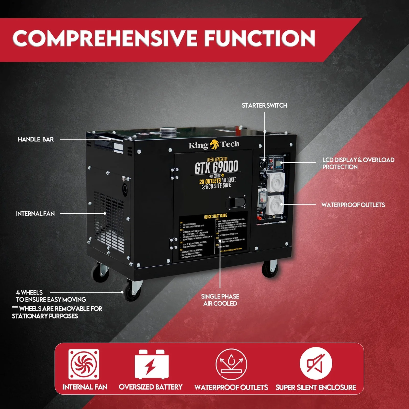The King Tech GTX 69000 Diesel Generator is the perfect combination of versatility and convenience whether you need power for your home, RV or project. It is ideal for stand by or prime power use, where the electricity is unavailable.