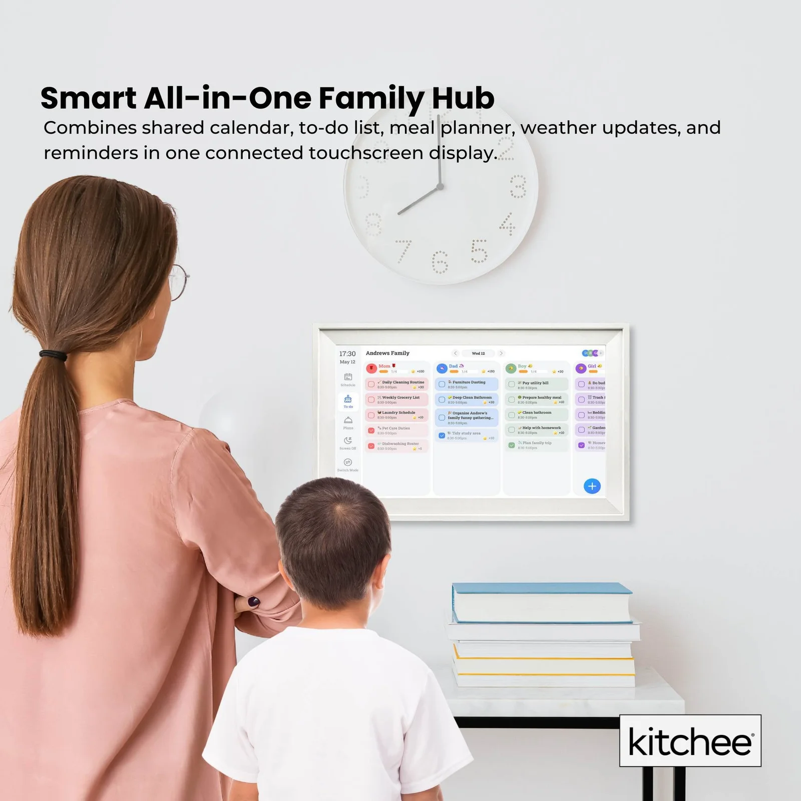 - Smart All-in-One Family Hub: Combines shared calendar, to-do list, meal planner, weather updates and reminders in one connected touchscreen display.