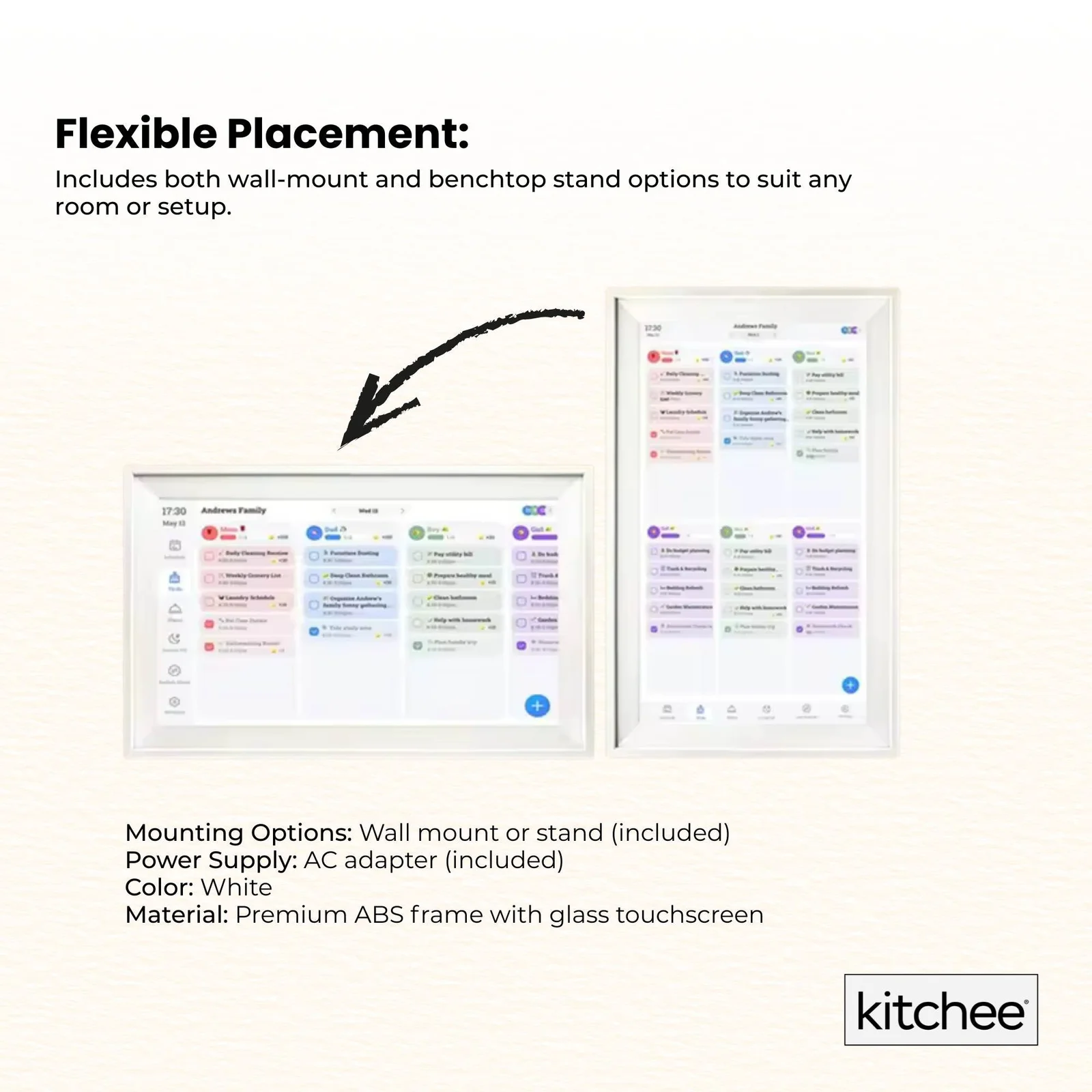 Kitchee Smart Digital Family Calendar is the all-in-one touchscreen planner that keeps your entire household in sync. Featuring a crystal-clear 15.6-inch (39.5 cm) HD display, this WiFi-connected device lets you view shared schedules, plan meals, manage chores, and sync calendars from Google, iCloud, Outlook, and more. Mount it on the wall or place it on your benchtop, it’s your digital family planning hub.
