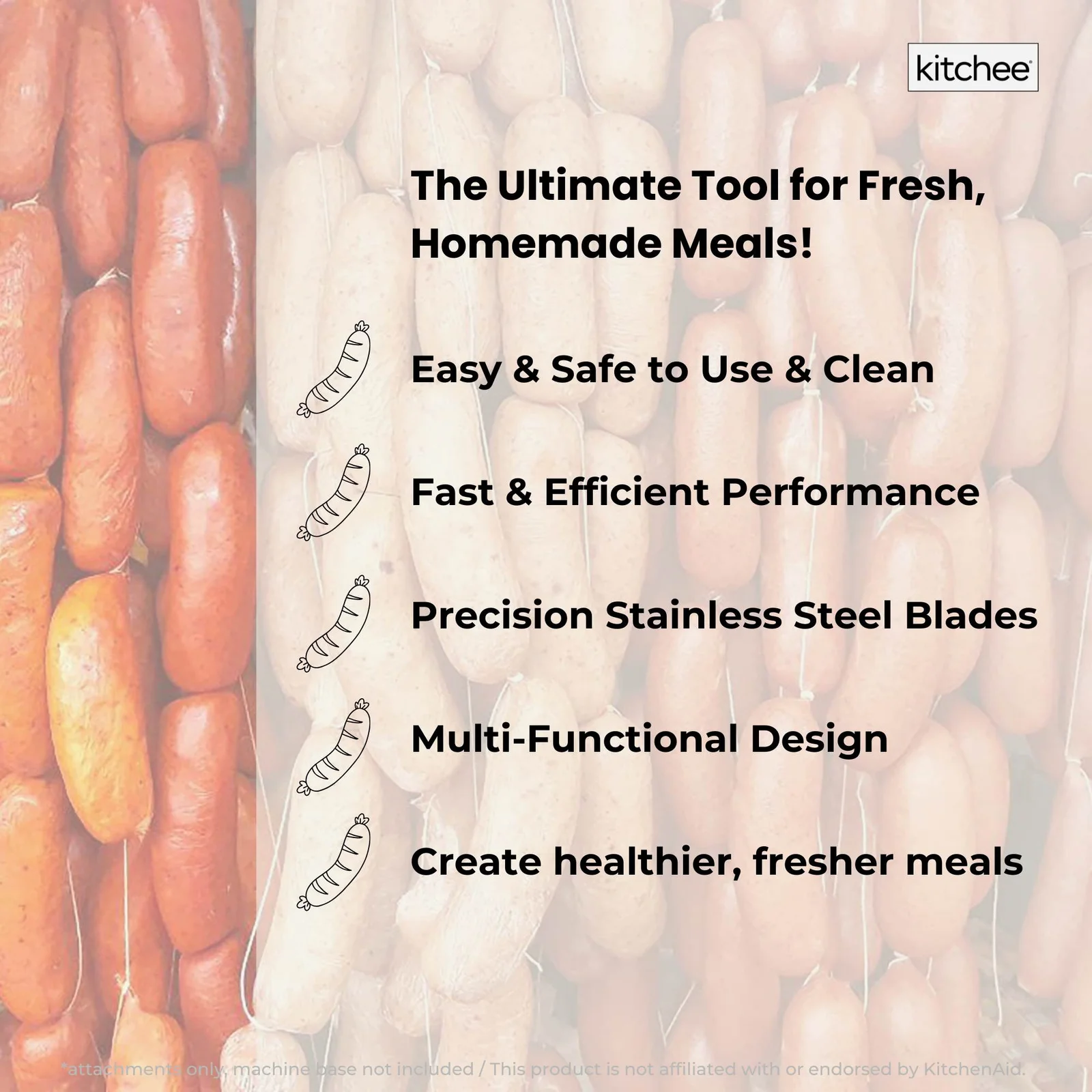 Turn your stand mixer into a powerful food prep machine with the Kitchee Meat Grinder and Sausage Stuffer Attachments. Designed to fit a wide range of stand mixers including most 4Qt, 5Qt, 6Qt, and 7Qt models, this high-quality attachment set lets you grind meats, vegetables, hard cheeses, and breadcrumbs with ease—or craft delicious sausages, burgers, and meatballs from scratch.