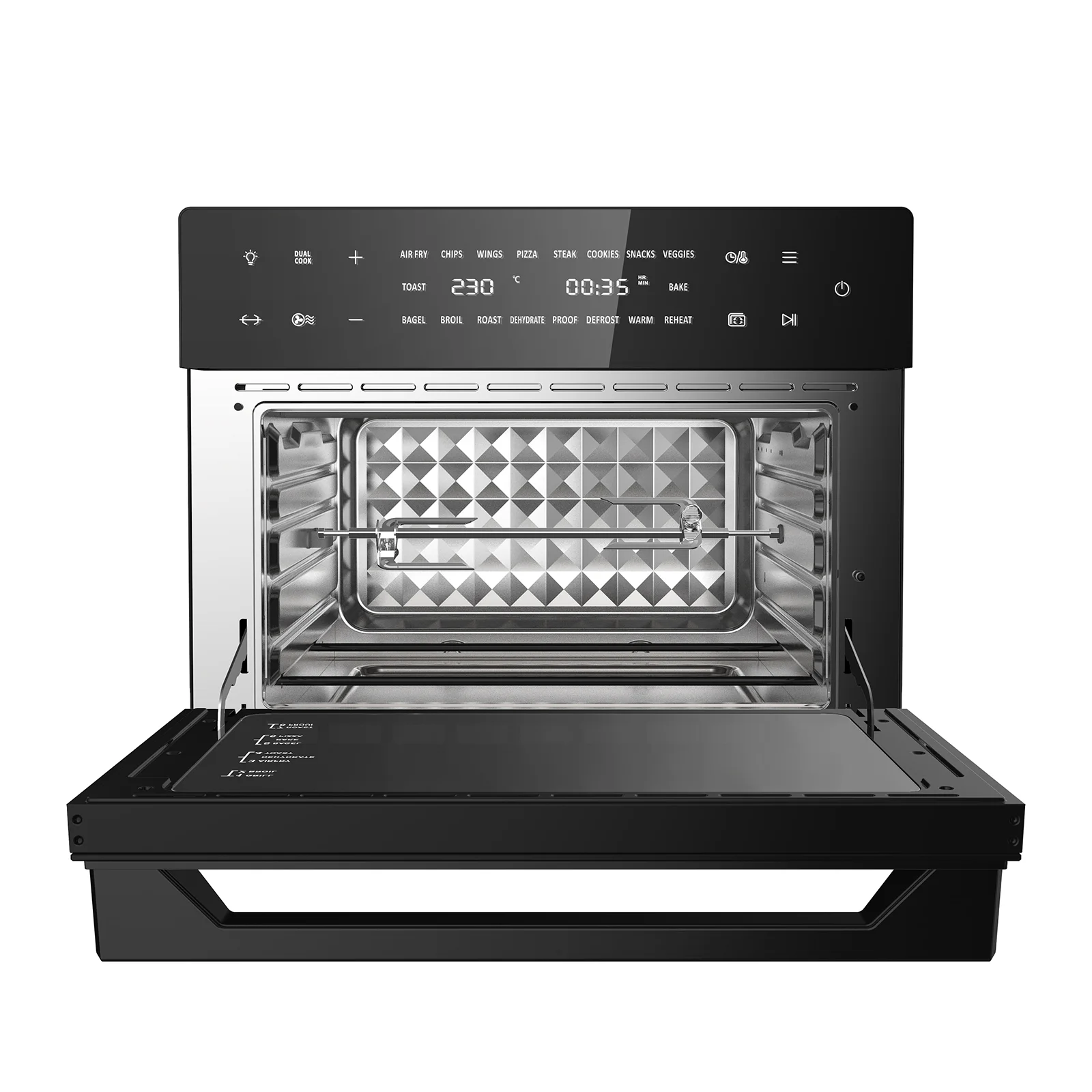 Comes with 6 bonus accessories: Oven rack, baking pan, air fry basket, crumb tray, rotisserie and remove handle