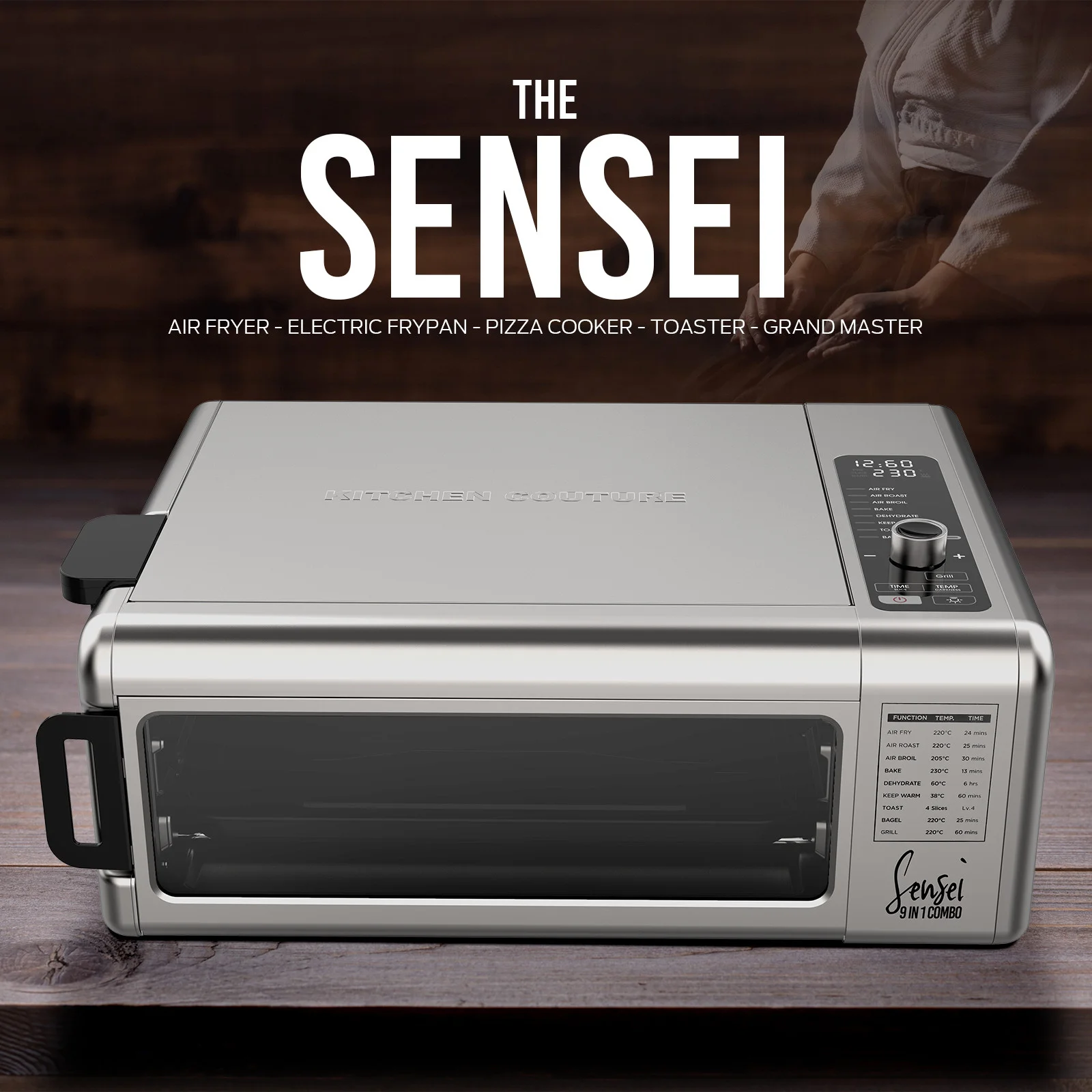 Kitchen Couture's most versatile Air Fryer ever, the Sensei 9-in-1 Digital Air Fryer is the first of its kind featuring all-new top loading Grill and Fry functionality.