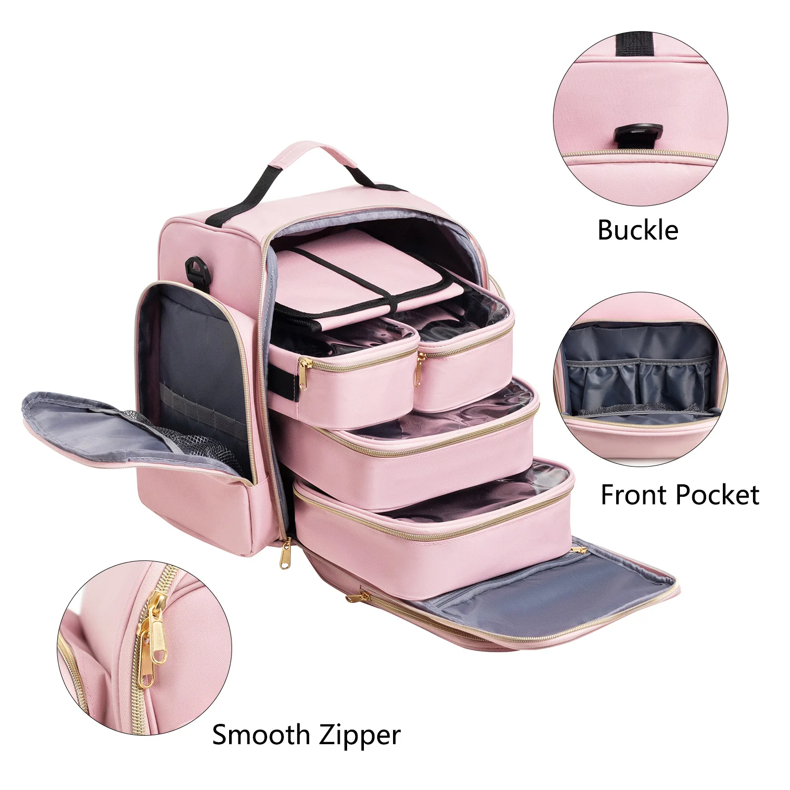 Organize all your cosmetics and beauty essentials with this incredibly spacious and versatile Travel Makeup Backpack. Designed for both professional makeup artists and beauty enthusiasts, this all-in-one solution ensures your items stay tidy and not messy. The backpack features a large capacity main compartment that houses 5 removable individual cases: two large pouches, two small pouches, and one hanging jewelry organizer roll. This modular design allows you to customize your storage for different essentials. Additional storage includes two side pockets for makeup brushes, a front pocket for eyeshadow palettes, and an inner mesh pocket for facial masks. Made for travel, it includes a luggage strap on the back to easily slide over a suitcase handle, a comfortable top handle, and a detachable padded shoulder strap.