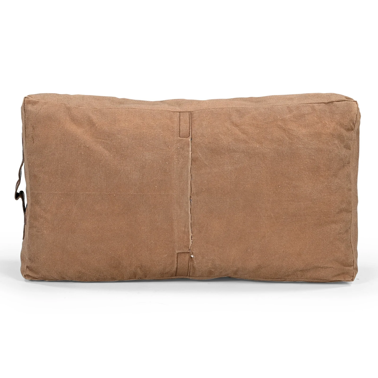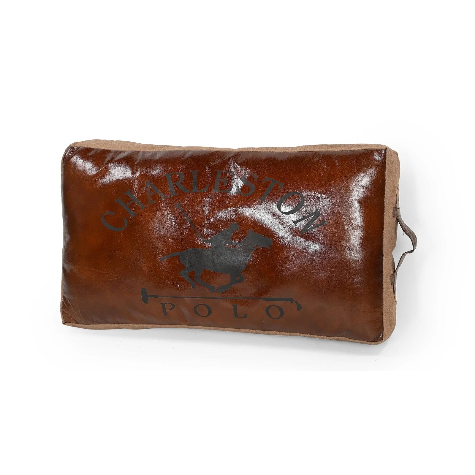 This beautiful recycled leather and canvas cushion, will add a rustic charm to any room. The Softened leather covering, with its impressive polo branding is incredibly stylish and comfortable. Recycled Indian Army tent canvas, leather handle
