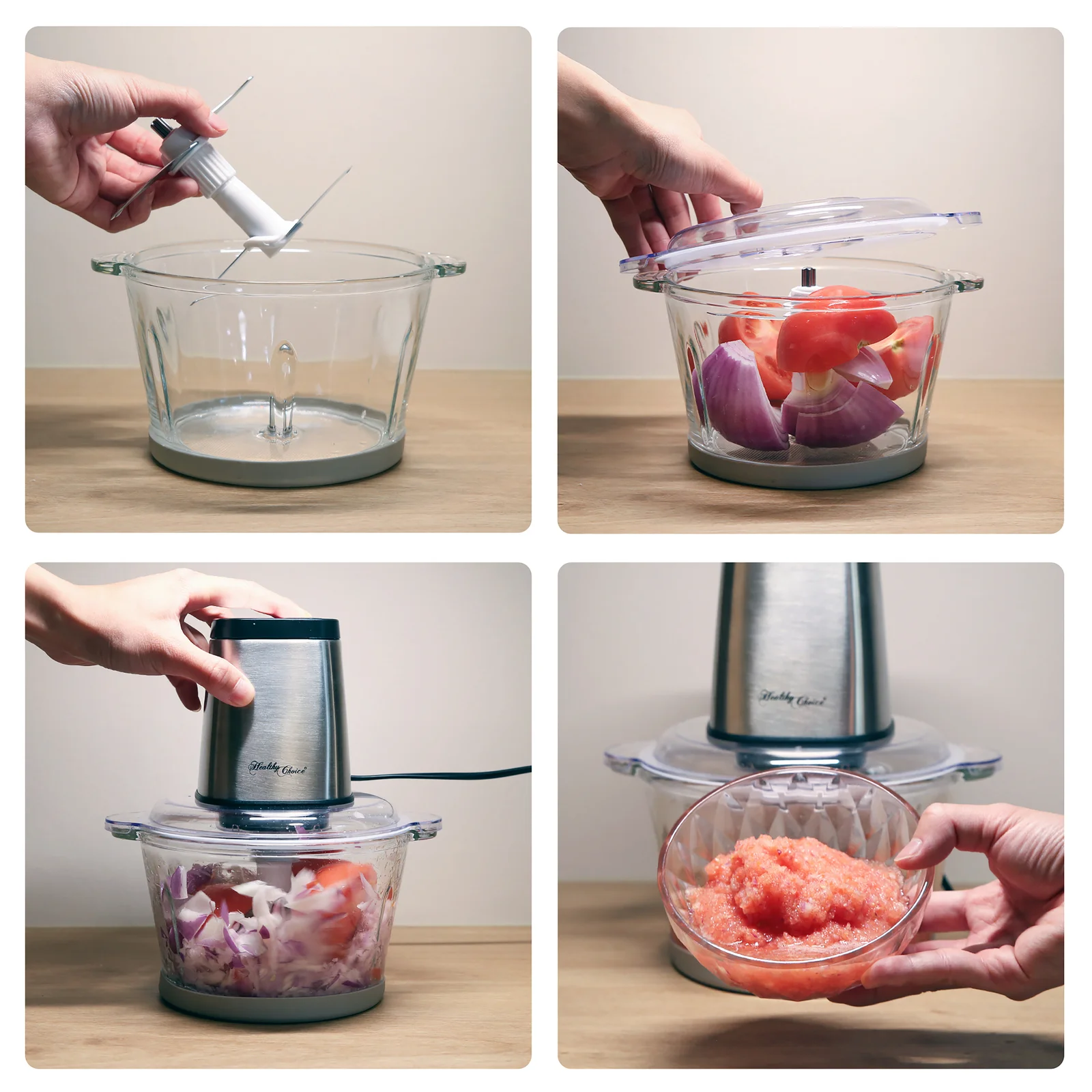 Pulsing, mincing, chopping, and ice crushing are all made simple with thishigh capacity food chopper. The stainless-steel blades are fast, efficient and powerful enough to crush ice. The included two litre glass chopper bowl, non-slip silicone ring base and blades are all dishwasher safe, making clean-up quick and easy.