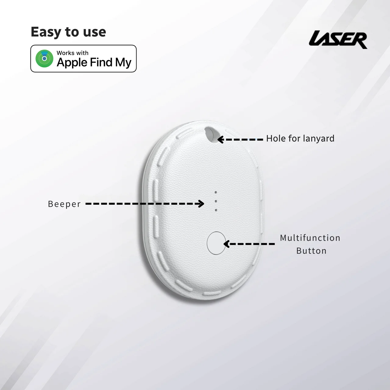 Keep track of your valuables with the Laser Mini Smart Tag in White. Designed to work seamlessly with the Apple Find My app, this compact and versatile smart tag is perfect for attaching to your keys, luggage, bags, or any personal items you want to keep secure.