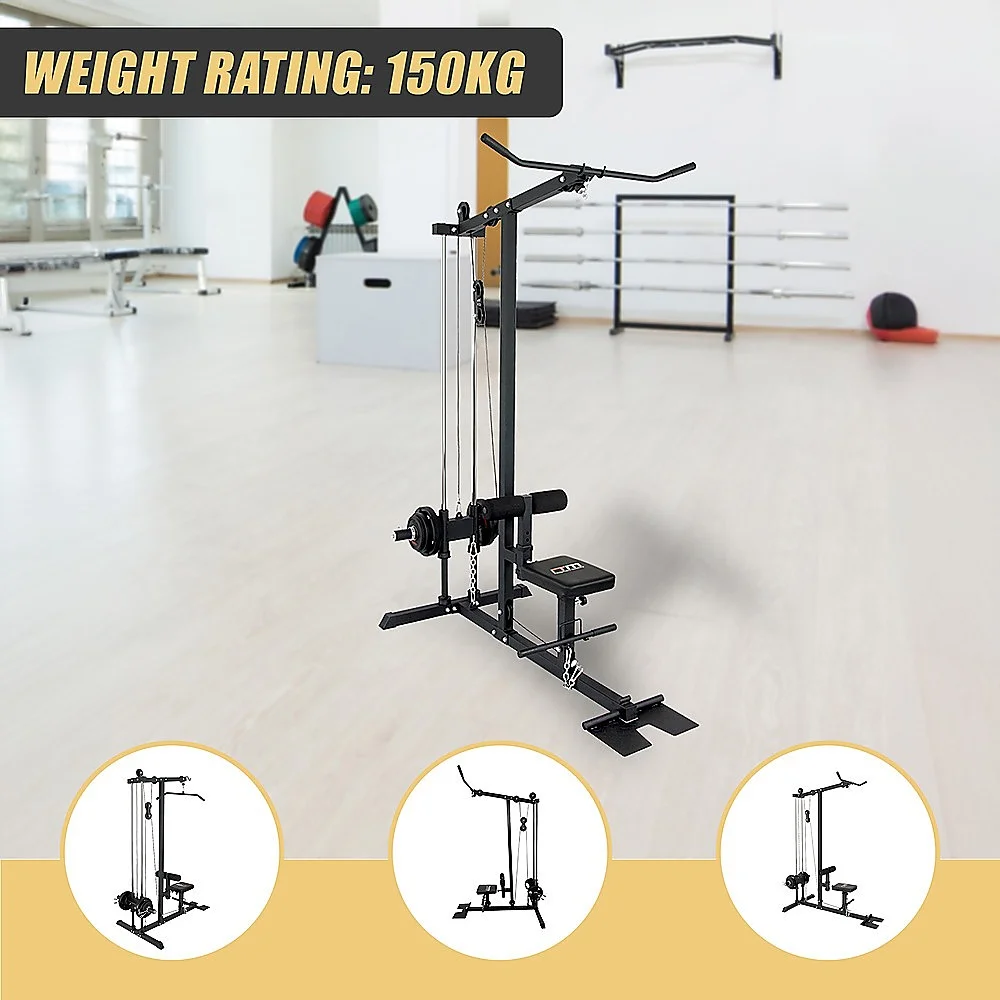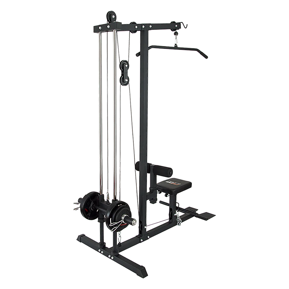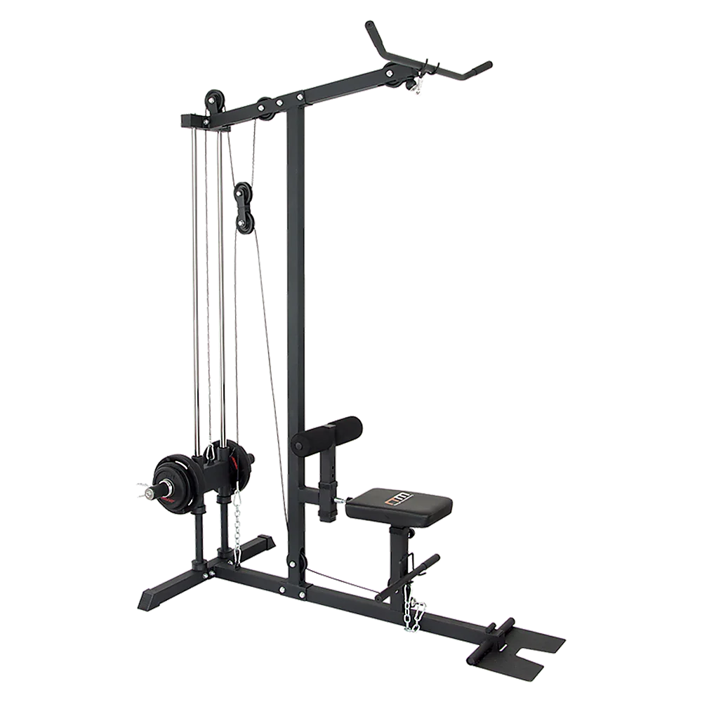 This new Fitness Plate Loaded Low Row / Lat Pull has a heavy duty steel construction. The solid unit has a dual guide rod system which provides the ultimate in safe, smooth and easy range of motion. The foot plate can be quickly flipped up in place for low rows. Lat Pull Down, Straight Row Bar and Standard and Olympic Weight Plate Adapters are included. Its no cable change design allows for easy adjustment from lat pull down to low rows.