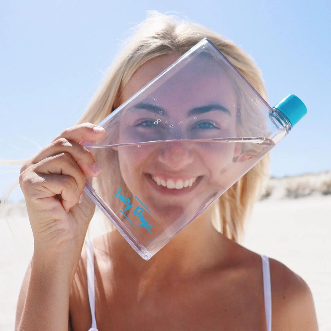 Did you get the memo? If not, then these Flat Bottles are the latest trend. Crystal clear with lids and matching print these bottles are roughly A5 in size and flat so they can easily be carried in a laptop bag or similar.