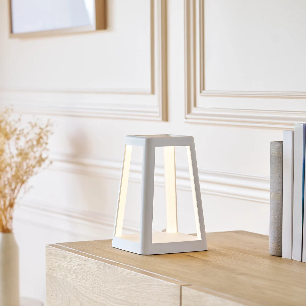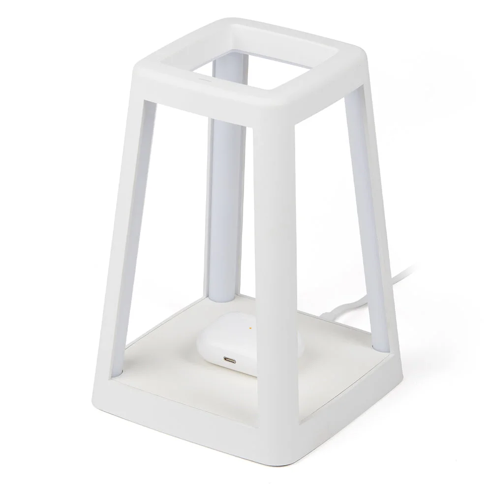 Lexon Lantern Portable Lamp With Built-In Wireless Charger - White - With the Lantern, you have complete control over your lighting setup. Simply press the touch button situated at the top of the lamp to switch between cool or warm white light, or select one of the 7 different LED colors available. Thanks to its dimmer function, you can adjust the brightness to suit your preferences, crafting the ideal atmosphere for any occasion. In addition to illuminating your space, the Lantern is also equipped with a built-in 15W wireless charger. Say goodbye to bulky cables! Simply place your smartphone or any other Qi-compatible device on the lamp base for fast and convenient charging. Crafted to be as beautiful as it is functional, the Lantern is perfectly suited for outdoor use, thanks to its IPX4 certification. Whether it's for an outdoor gathering or a picnic, the Lantern is your ideal companion. Get the most out of the Lantern's light during your evenings with its impressive battery life of up to 8 hours. Simply recharge it via USB-C using the provided cable.