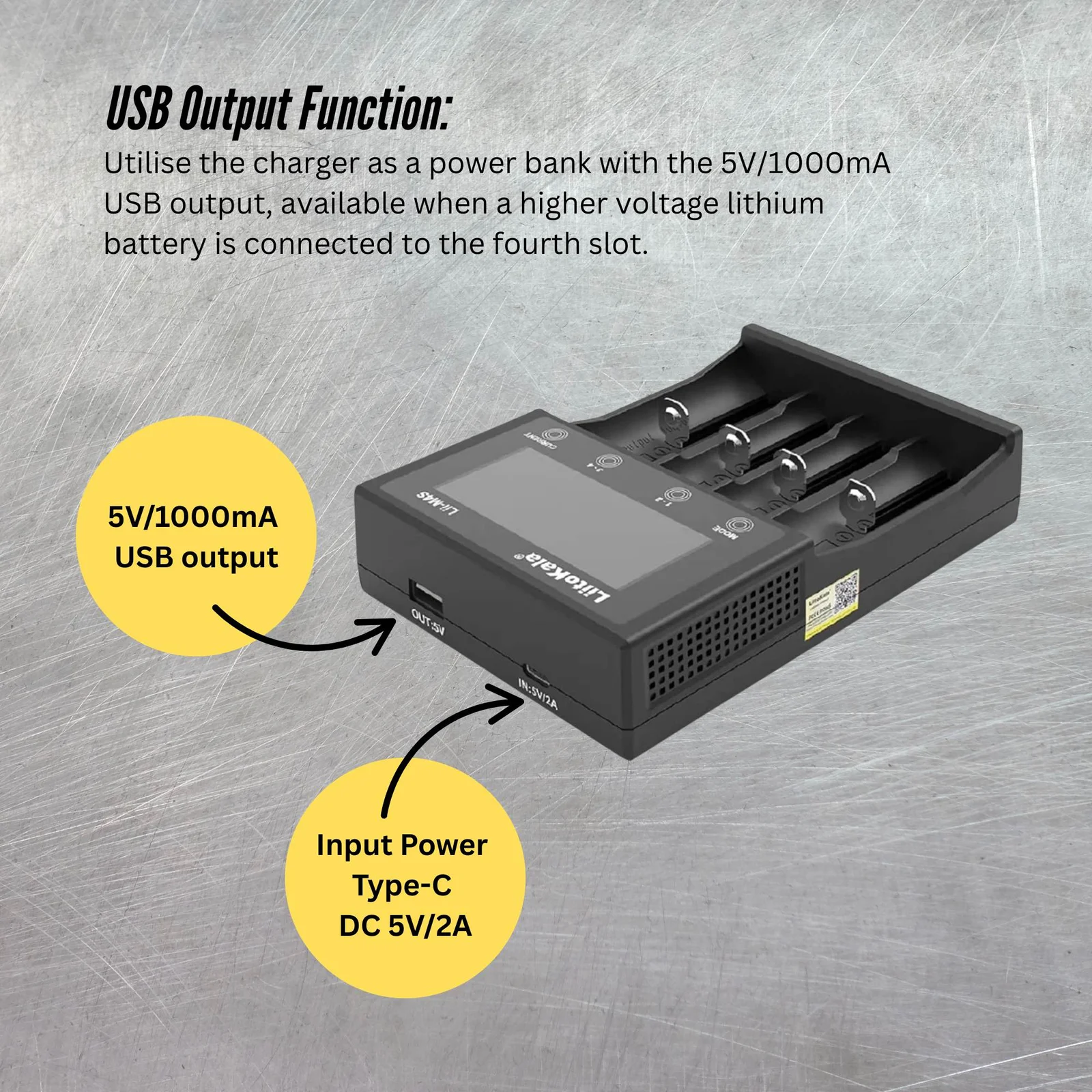 USB Output Function: Utilise the charger as a power bank with the 5V/1000mA USB output, available when a higher voltage lithium battery is connected to the fourth slot.