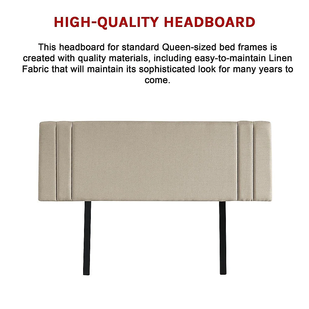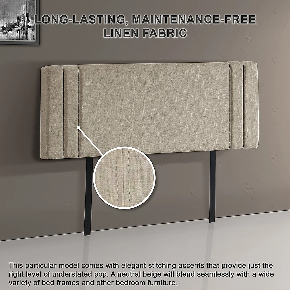 This headboard for standard Queen-sized bed frames is created with quality materials, including easy-to-maintain Linen Fabric that will maintain its sophisticated look for many years to come. This particular model comes with elegant stitching accents that provide just the right level of understated pop. A neutral beige will blend seamlessly with a wide variety of bed frames and other bedroom furniture.