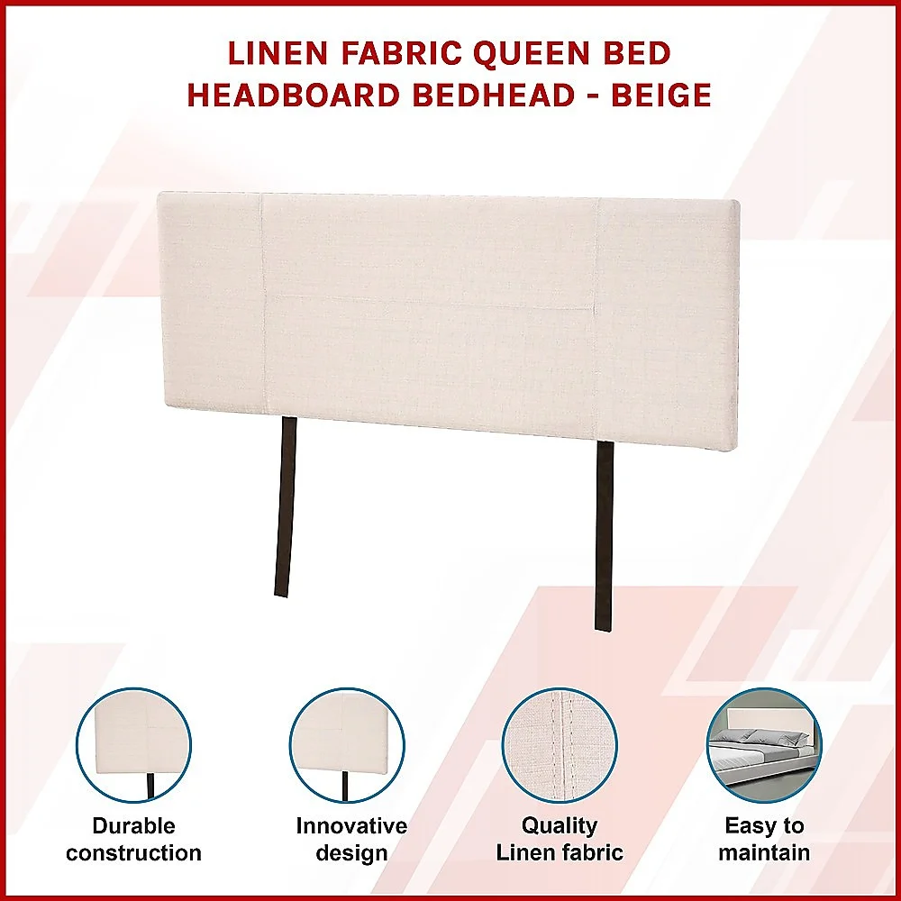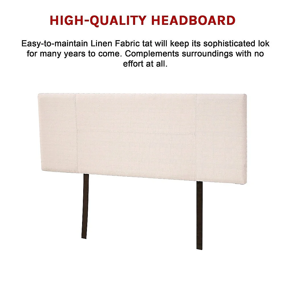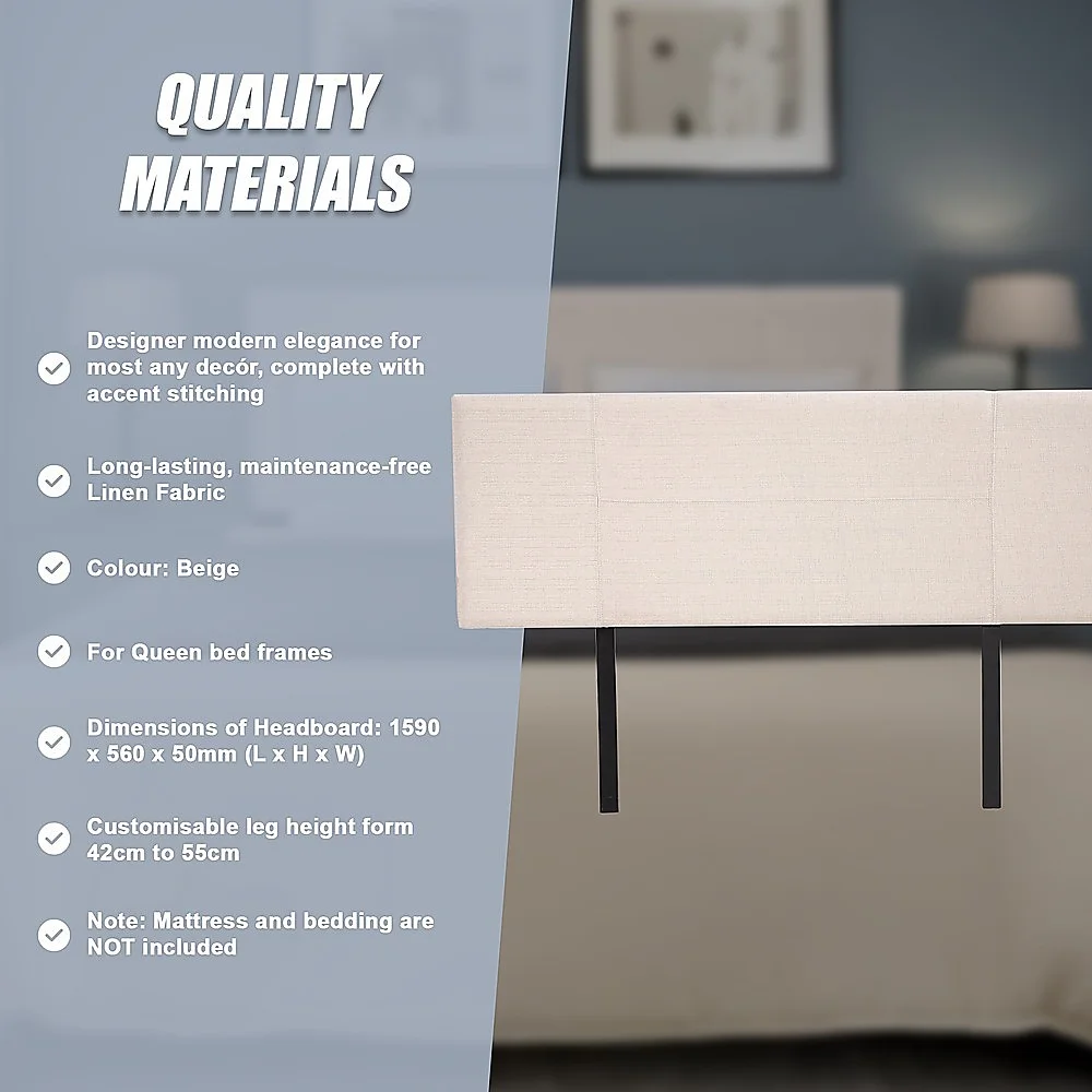 This headboard for standard Queen-sized bed frames is created with quality materials, including easy-to-maintain Linen Fabric that will maintain its sophisticated look for many years to come. This particular model comes with elegant stitching accents that provide just the right level of understated pop. A neutral beige will blend seamlessly with a wide variety of bed frames and other bedroom furniture.