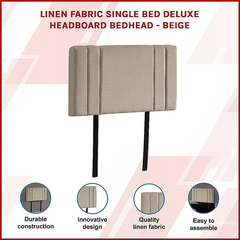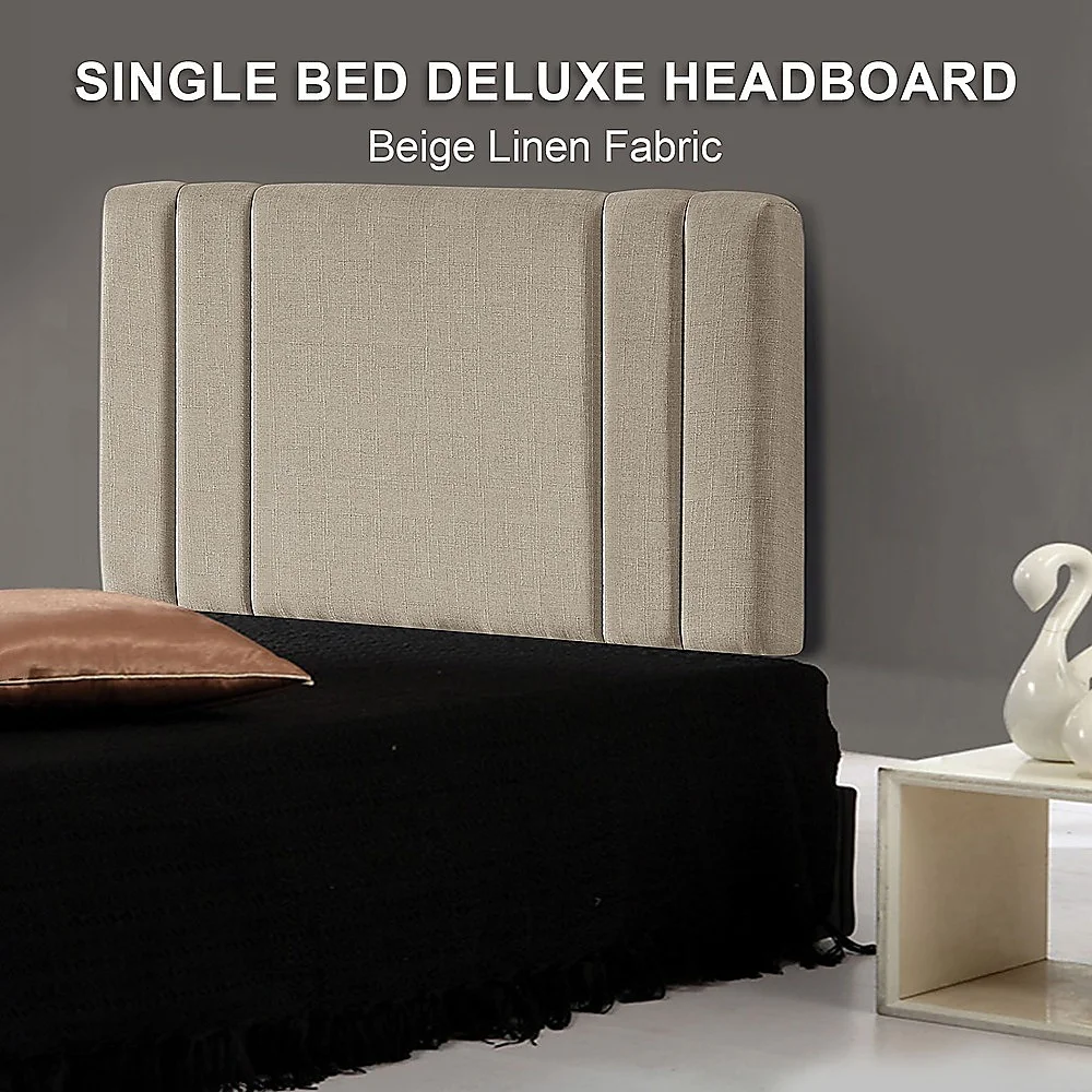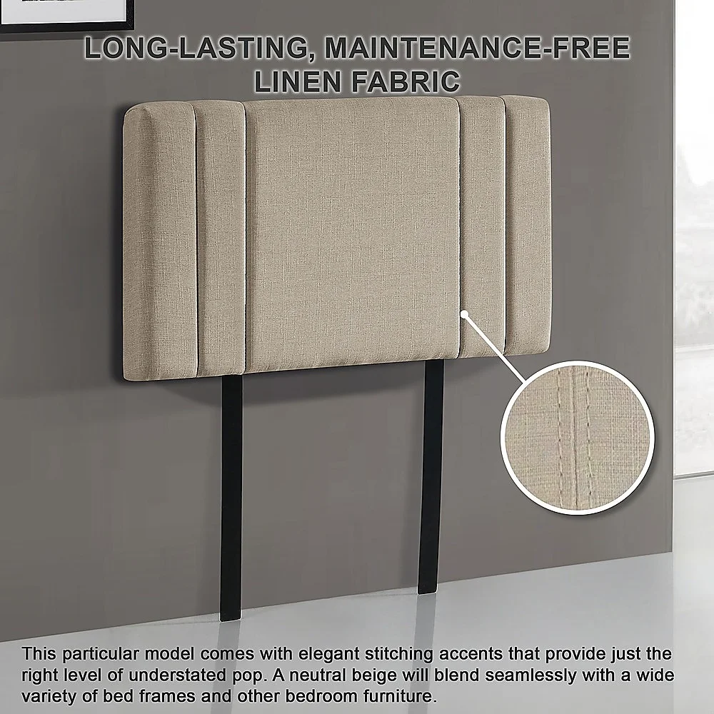 This headboard for standard Single-sized bed frames is created with quality materials, including easy-to-maintain Linen Fabric that will maintain its sophisticated look for many years to come. This particular model comes with elegant stitching accents that provide just the right level of understated pop. A neutral beige will blend seamlessly with a wide variety of bed frames and other bedroom furniture.