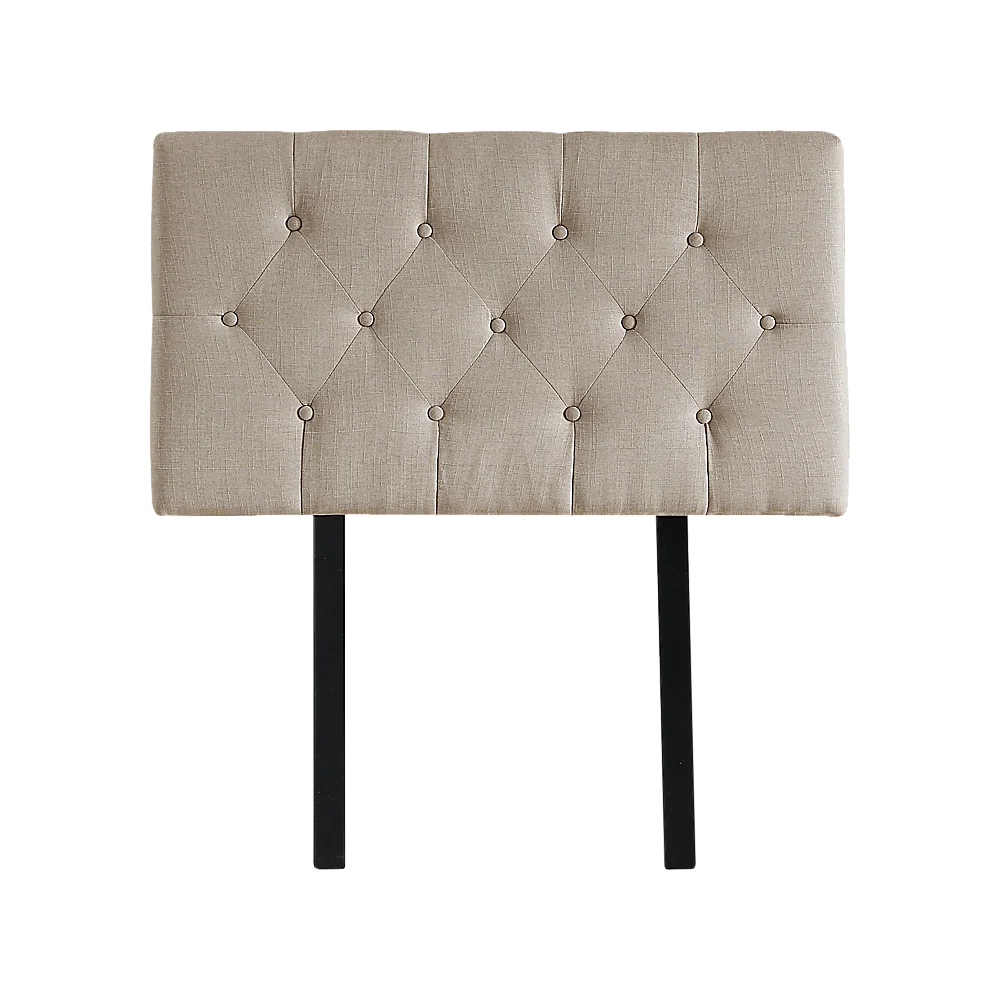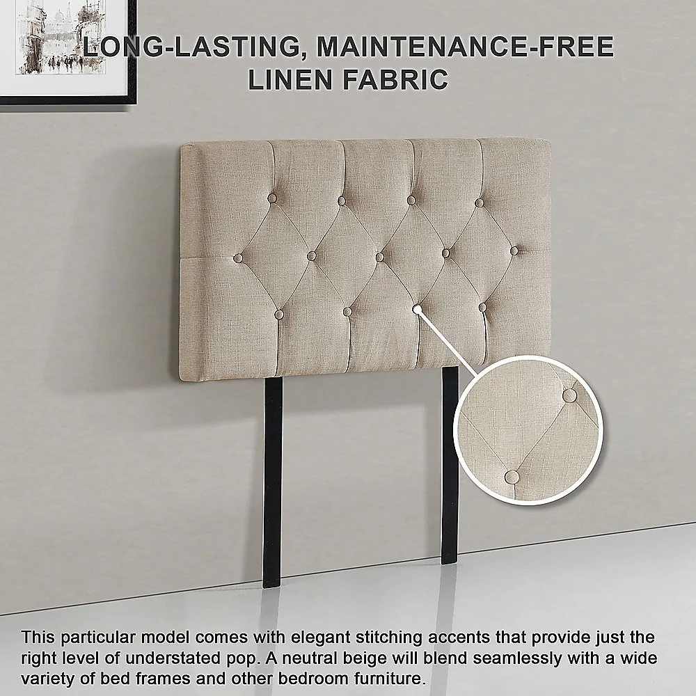 This headboard for standard Single-sized bed frames is created with quality materials, including easy-to-maintain Linen Fabric that will maintain its sophisticated look for many years to come. This particular model comes with elegant stitching accents that provide just the right level of understated pop. A neutral beige will blend seamlessly with a wide variety of bed frames and other bedroom furniture.